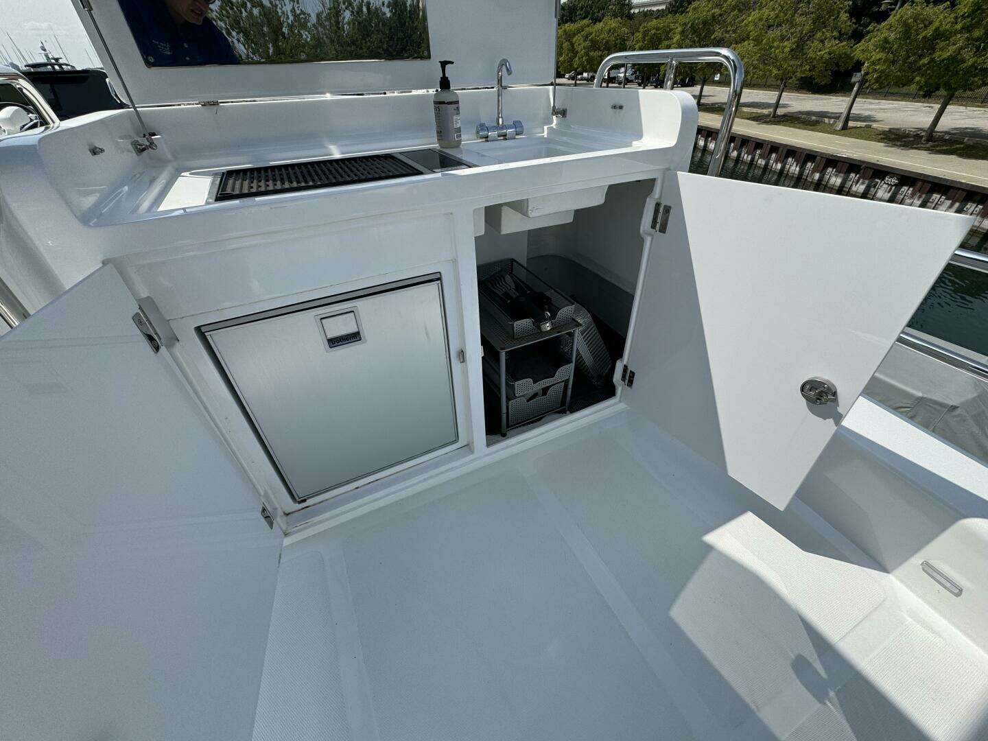 Hybrid carbonfiber flybridgeNonskid surface floor finishHinged access weathertight hatch in white aluminium and Plexiglas®U-shaped seating area for up to 6 people on starboard sofa, with storage underneath Table for up to 8 people, with teak laid topMast for 18? 4kW HD radar, VHF antenna, horn and navigation equipment Shower with hot/cold water mix on mastWetbar with sinkStorage behind helm stationAft sundeck area for optional seating area, chaise longueHelm station with double seating areaFore sundeck area with cushion and storage underneathSkylight for the lower deck stairsNavigation lightsHelm station with high resistante grey gelcoatForward-backward adjustable flybridge bench helm seatCovers for seats, sun bathing cushions and tableExtra conduits connecting engine room with mast and console Helm station equipped with:Steering wheelGarmin 10’’ MFD GPSMAP 8610Garmin GHS 11 VHF radioDepth/Speed transducerAnchor windlass controlNavigation/anchor lights switch12V socketUSB socketInterceptor controlChain counterHorn switchCompassActivation of bilge pumpsBow thruster joystickStern thruster joystickFire extinguisher alarm panelMonitoring system functions integrated in to chartplotter displays: Grey water level gaugeBlack water level gaugeFresh water level gaugeFuel tank level gaugeShore power connection status-alarmTenderlift platform position statusBilge high level alarm