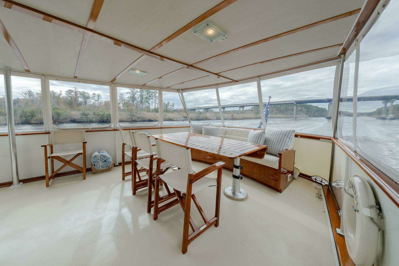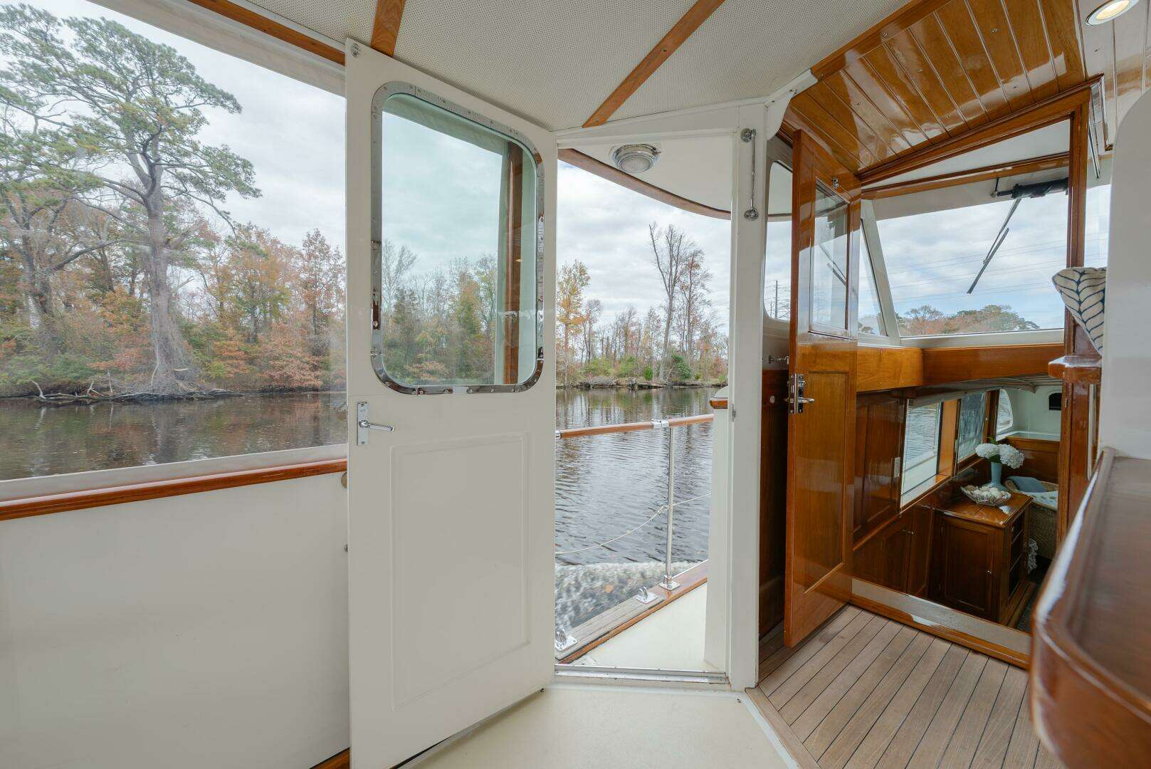 • Glassed-over wood deck with varnished teak trim