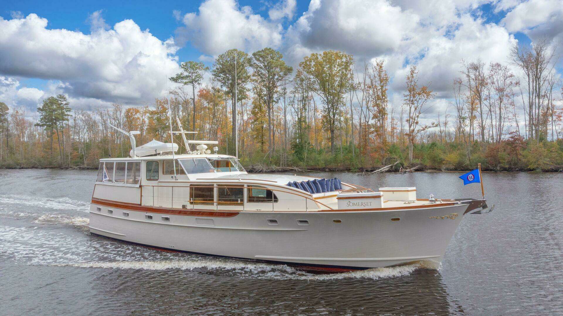 SOMERSET, Contract #442, is the sixth-to-last Trumpy built. Commissioned by Mr. Gerrish Milliken, Jr., of the textile industry, her original name was SPINDLE; then, later, SOMERSET by her second owner, a name also retained by her third. She was completely rebuilt from the keel up in 2012 - 2013. The refit included a new bottom, keel frames and floors, fully rebuilt engines, new generators, new tanks and plumbing, entirely new wiring and electrical systems, new interior, wall coverings, and paint. She exemplifies the quality and style synonymous with the Trumpy name, and those inspecting her will find her ready to go in great shape with no known deficiencies.