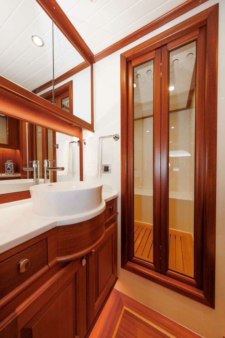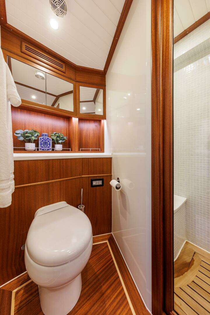 The master head is in the forepeak with an amazing stall shower, mahogany cabinetry and mirror faced storage compartments.