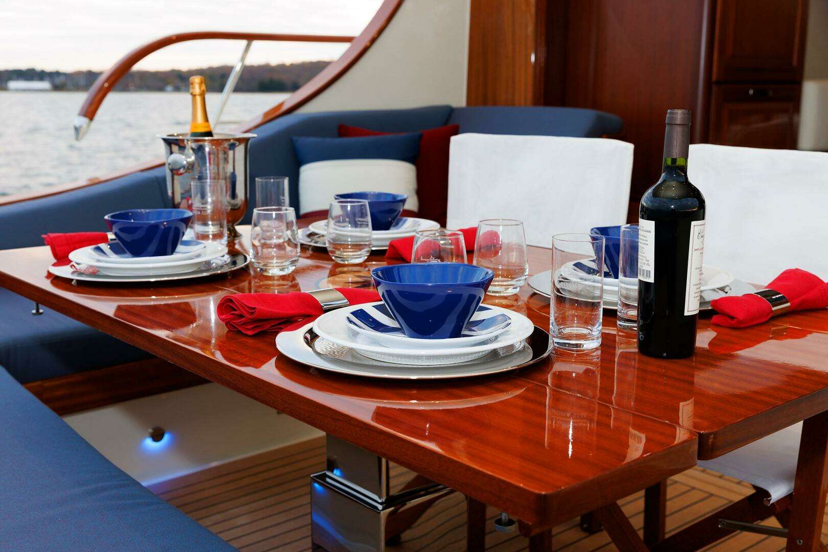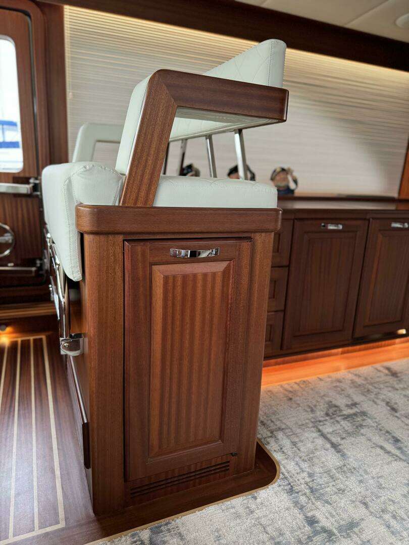 Vicem made custom mahogany captain's chairs to make al fresco dining a breeze. The electric hi-low varnished mahogany cockpit table is supported with custom polished stainless square base, adding more style to the cockpit. Port side is a covered cabinet that provides a workspace alongside an electric grill as well as storage and trash.