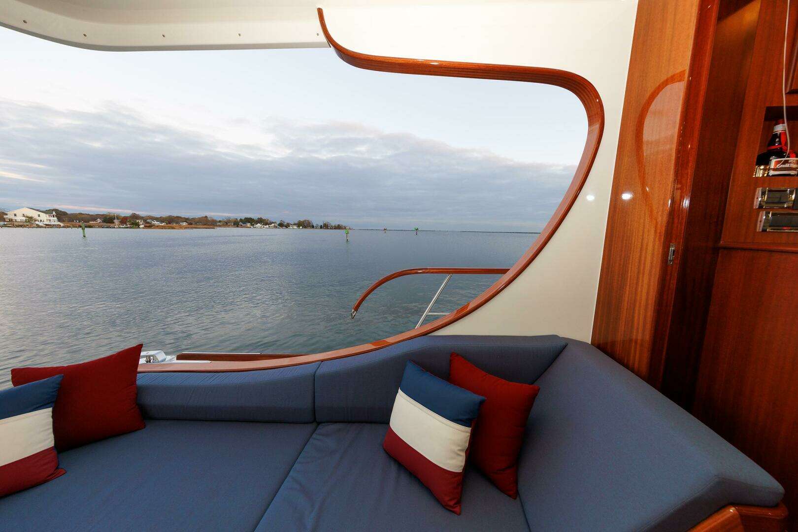 Triple mahogany and glass doors slide to starboard opening up the cockpit to the salon and galley giving twice the entertaining space by being able to utilize the open design between the cockpit and salon