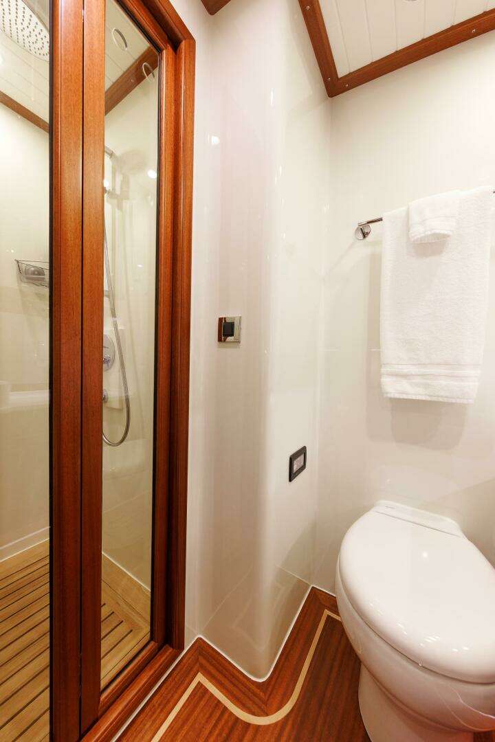 Guest cabin is aft and down a few steps. Outfitted with both a double berth and a single pullman, this cabin makes is perfect for captain and crew as well as children or adult guest. A private head with separate stall shower makes this space complete.
