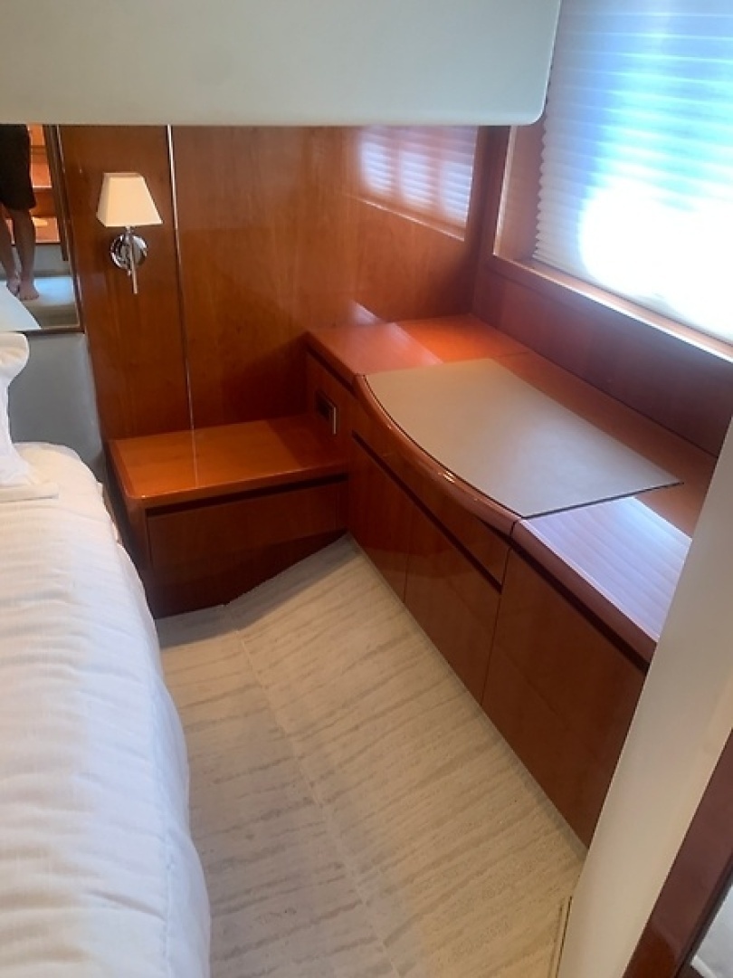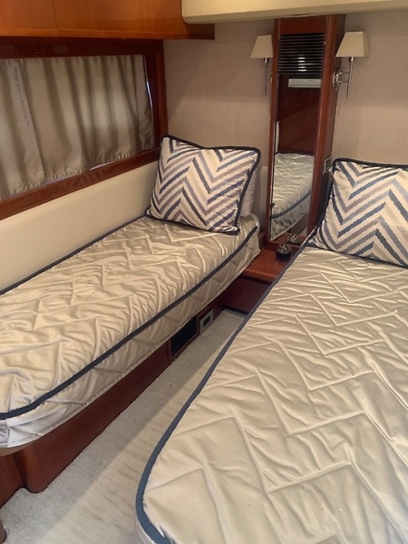 Moving forward and down five steps, you enter the accommodations level designed to impress. The guest cabin sits to starboard, the VIP stateroom is positioned forward with generous space, and the full‑beam master suite aft provides the comfort and privacy expected in a yacht of this caliber.