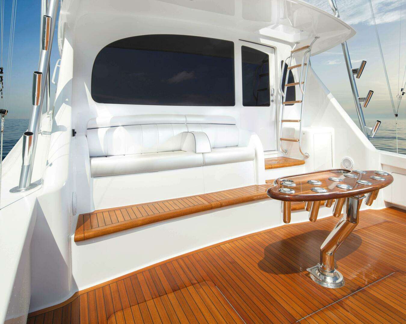 The cockpit sole is built with a laminated mounting plate for fighting chair, rocket launcher or table installations. Standard cockpit equipment includes flush-mounted rod holders; a side locker for gaffs; a walk-through transom door with lift gate; rounded coamings and toekick space for comfort and balance; and fresh and seawater wash downs.