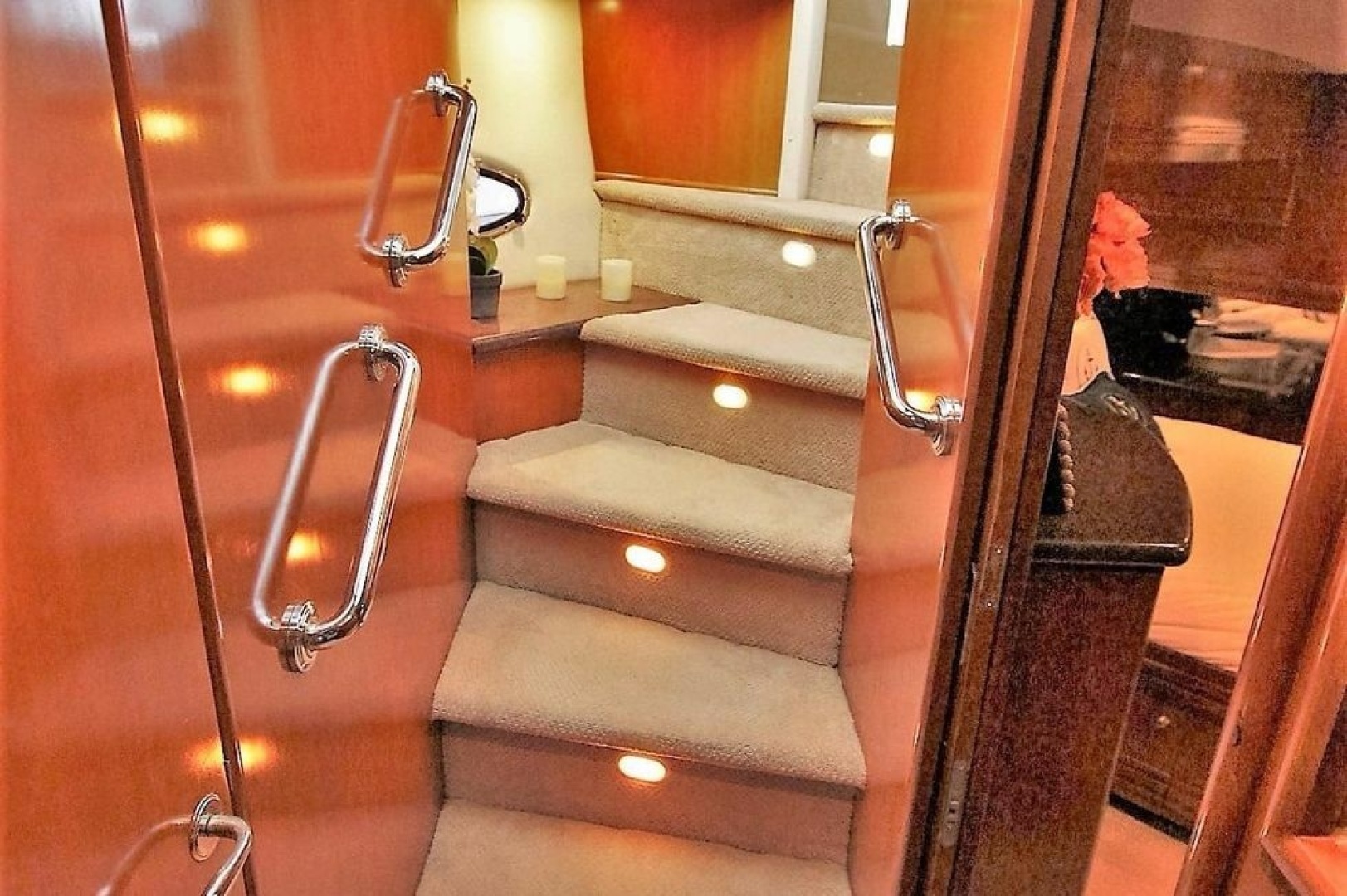 Forward, our test boat featured a Harman/Kardon component stereo system that plays through Bose surround sound speakers. Overhead, 14 halogen spotlights provided abundant illumination – in addition to the boat’s big full-view windows.