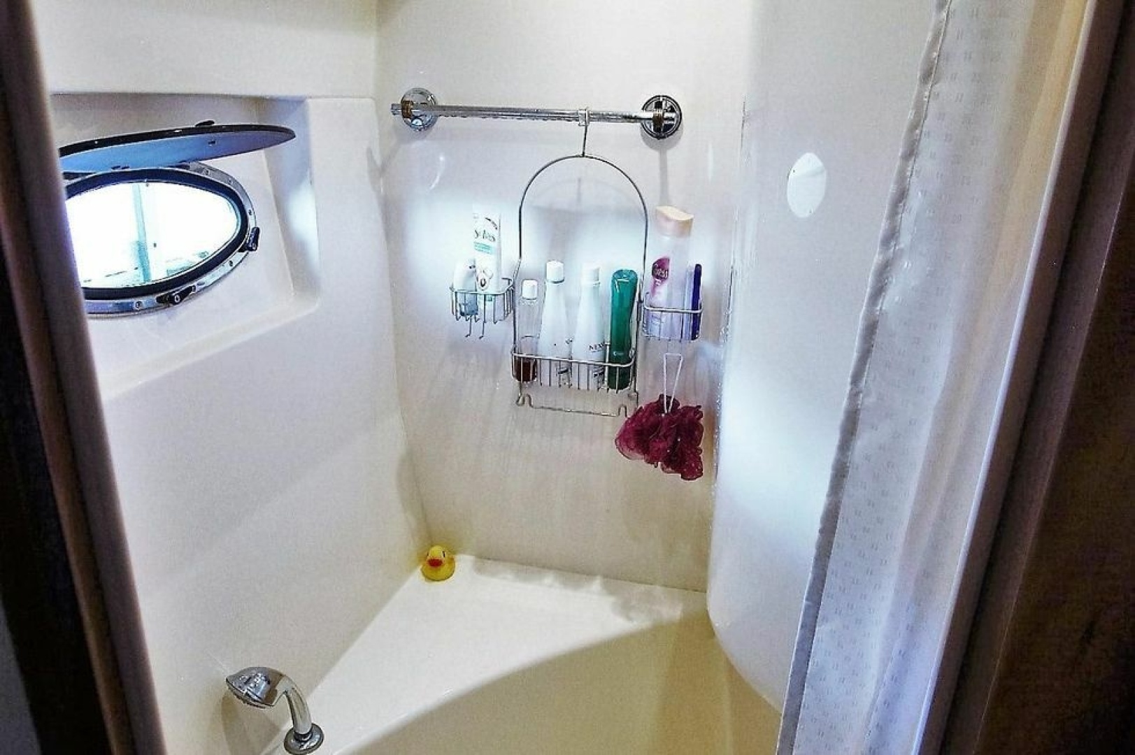 It is adjacent to a guest head (shared with the third stateroom), with a Vacu Flush head, a sink and vanity and a stall shower.