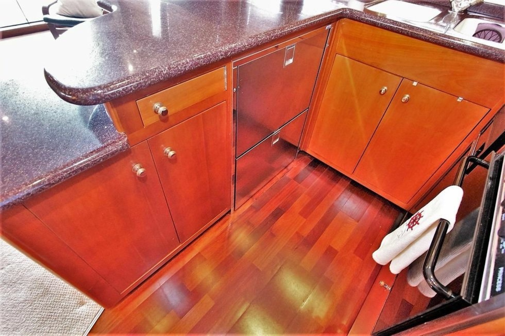 Our test boat’s U-shaped galley, on the other side of the Karadon counter, offers Sub-Zero under-counter refrigerator and freezer units, a double sink, a Princess three-burner range and oven, a cabinet-mounted Black & Decker coffeemaker and a built-in Sharp microwave/convection oven. The galley area has a hardwood floor and ample cabinets for storage.
