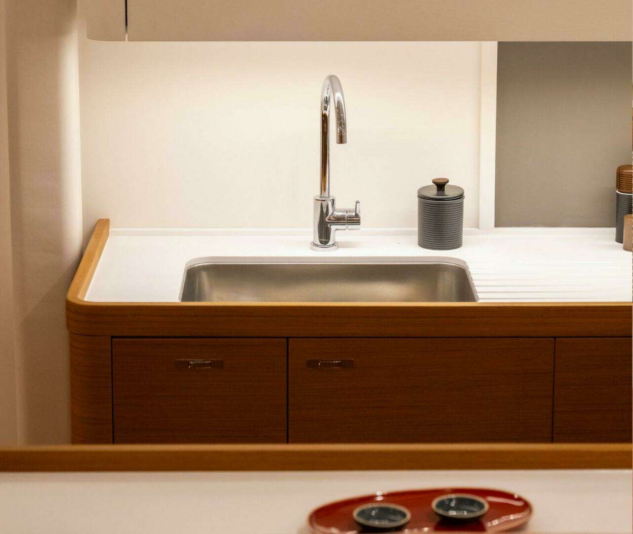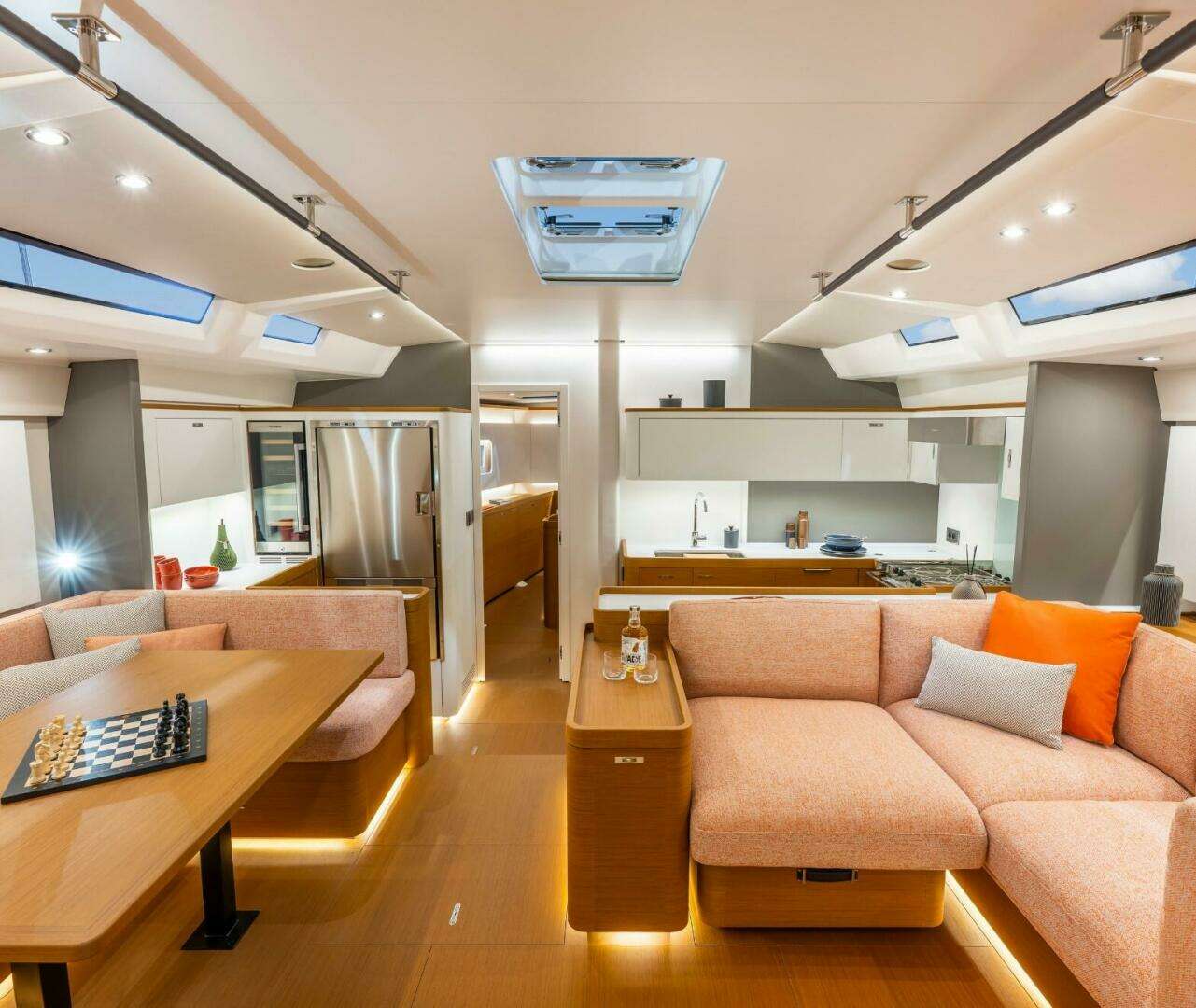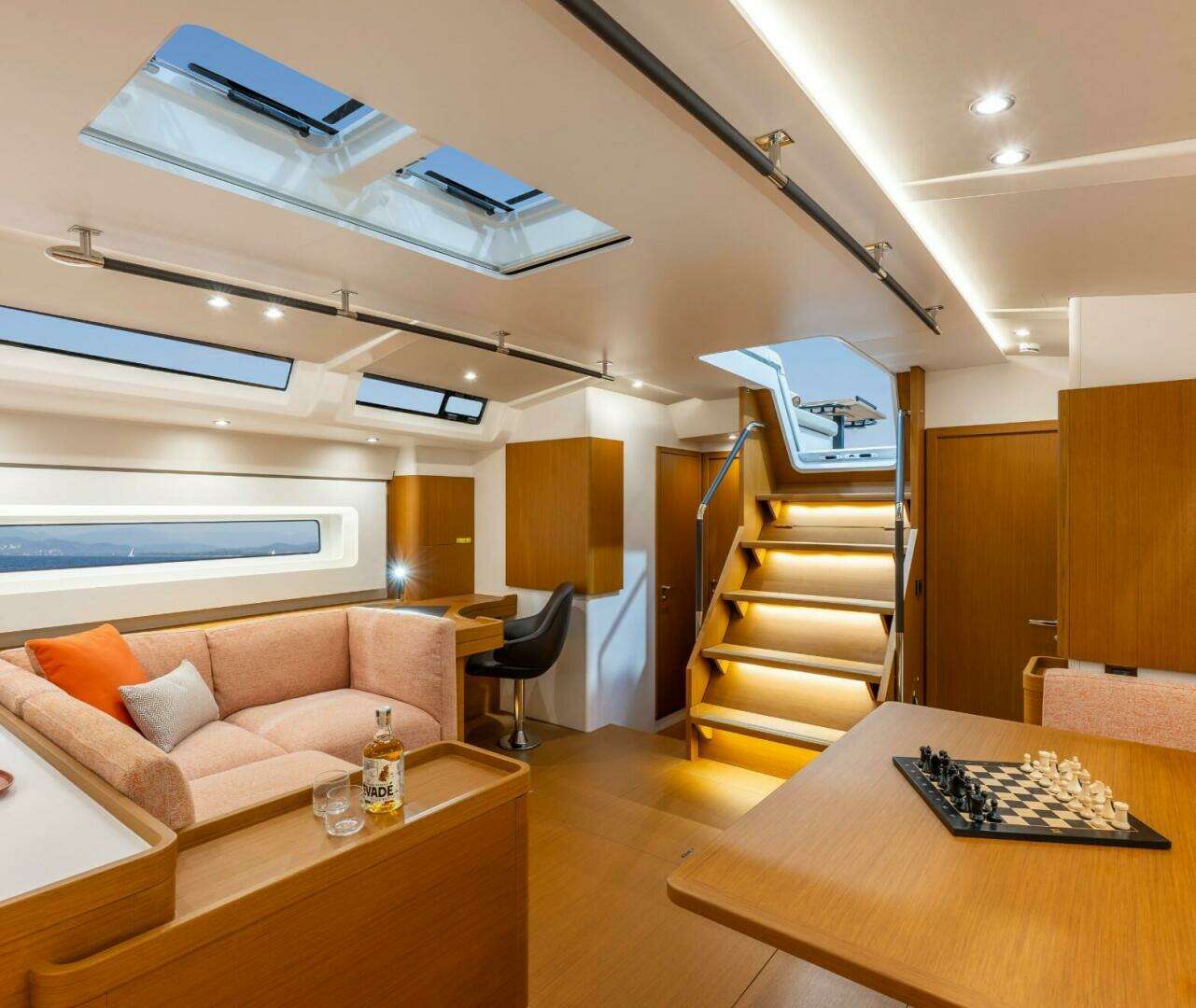 Below decks, the First 60’s interior elevates life at sea with spacious, well-lit accommodations that blend comfort and function. A cozy dining area faces the owner’s navigation corner and sofa, while the full-beam galley — with elongated worktop and abundant storage — supports efficient meal preparation even under sail. The owner’s cabin is a standout retreat with a large walk-around, forward-facing berth, generous natural light, and tranquil sea views that enrich long passages or overnight stays.