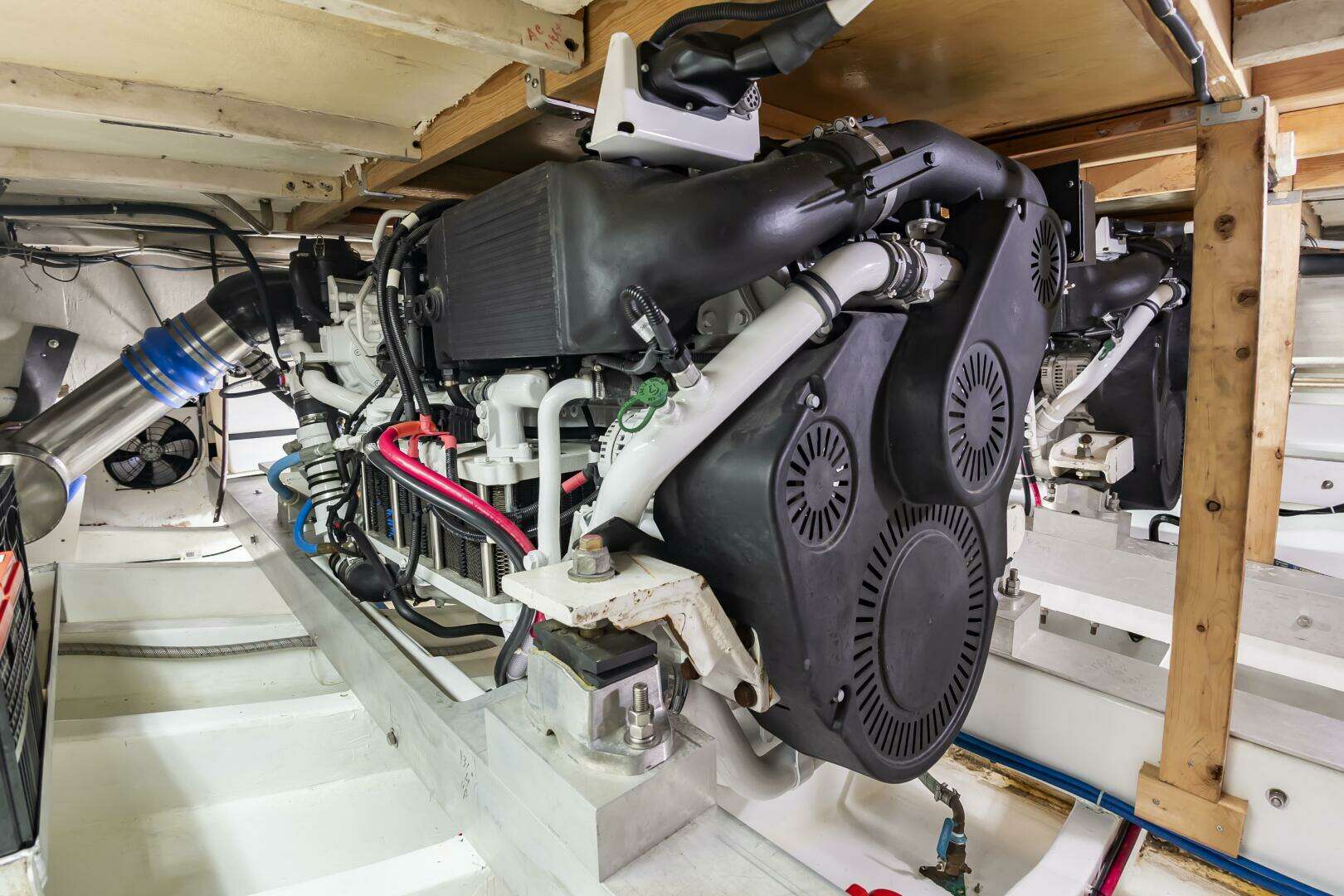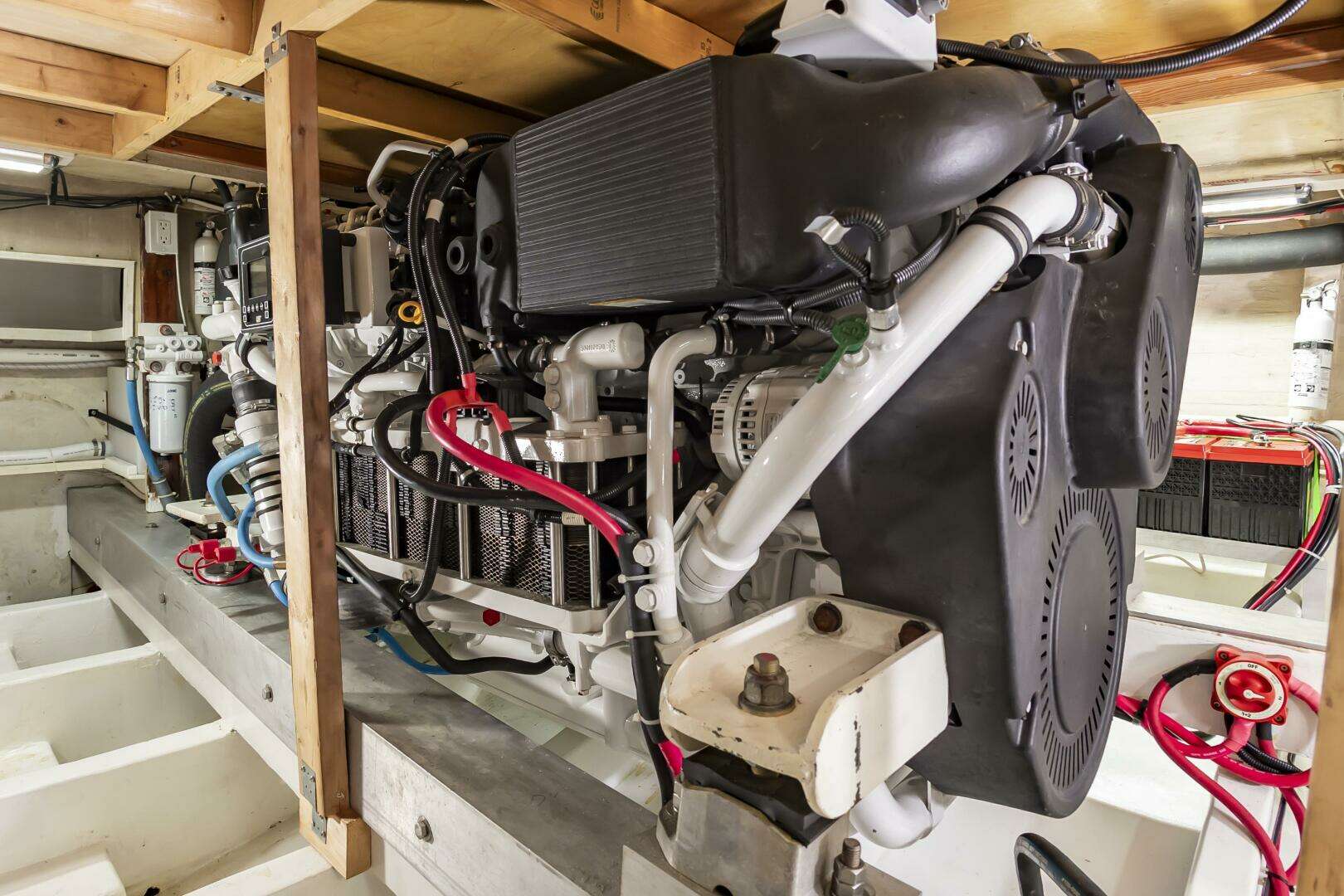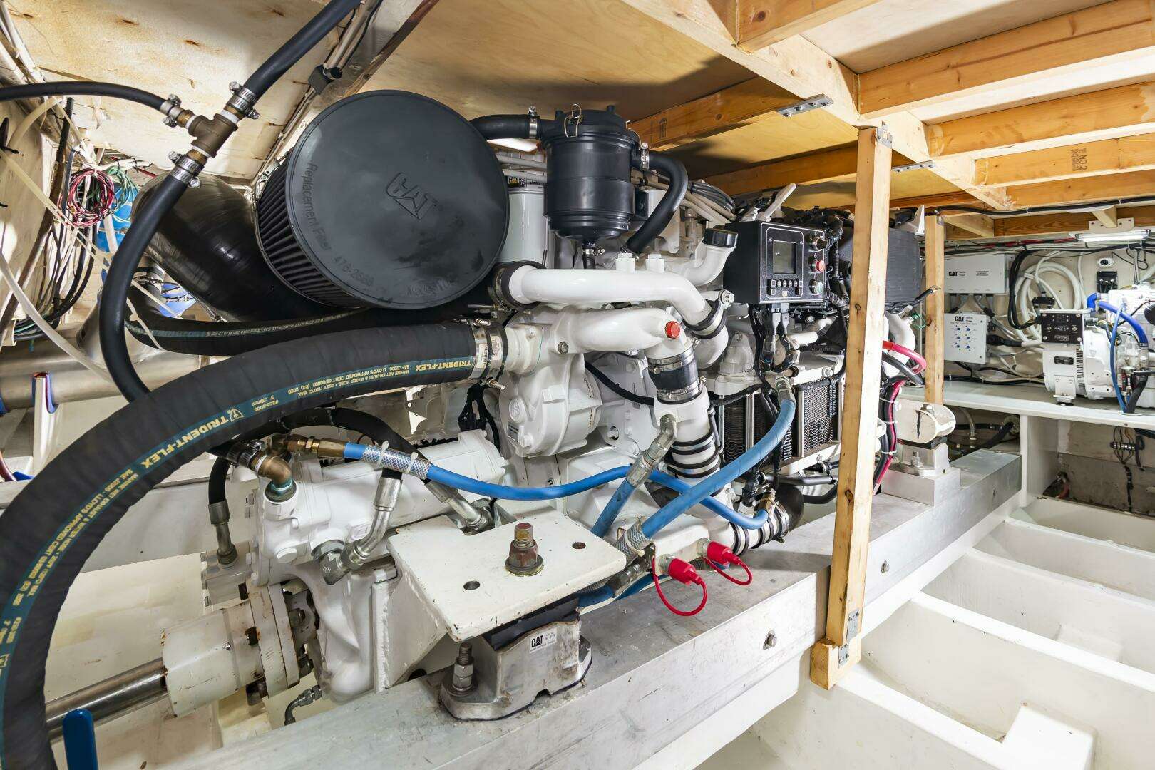 In 2022, she underwent a comprehensive mechanical refit that transformed her capabilities. Highlights include a conversion from a single engine to twin Caterpillar 12.9s producing 1,000 hp each, along with new transmissions, shafts, struts, rudders, and props. Additional upgrades include a new generator, new HVAC system, freshly repainted hull and topsides, new bridge-deck hardtop and frame, new fuel tanks, and much more.