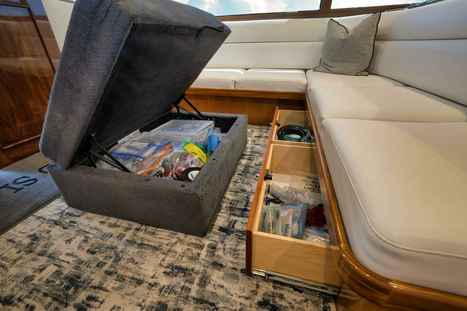 Just forward of the starboard sofa is a customized cabinet with a hinged granite countertop that houses a drop-in 11-cubic-ft. deep freezer.
