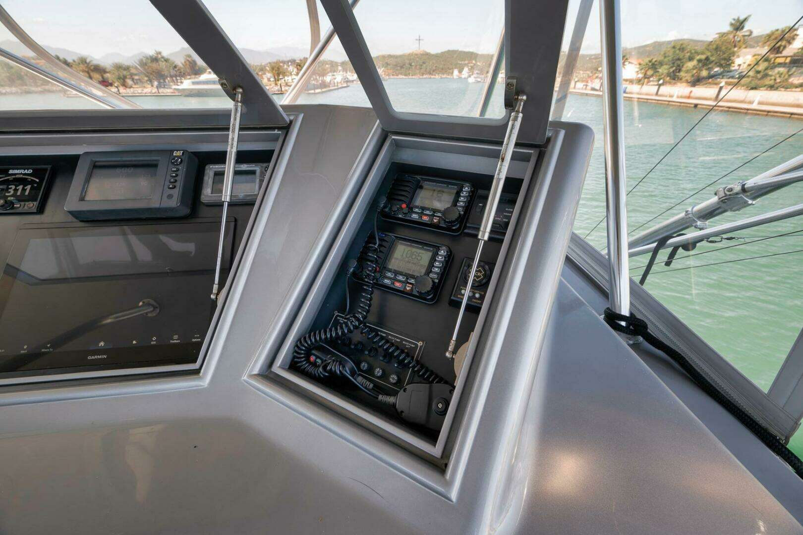 Single Release helm chair, faux teak helm pod with single lever controls, custom electronics cabinet with hinged, clear acrylic windows provide for flush mounted, weather protected displays and radios.