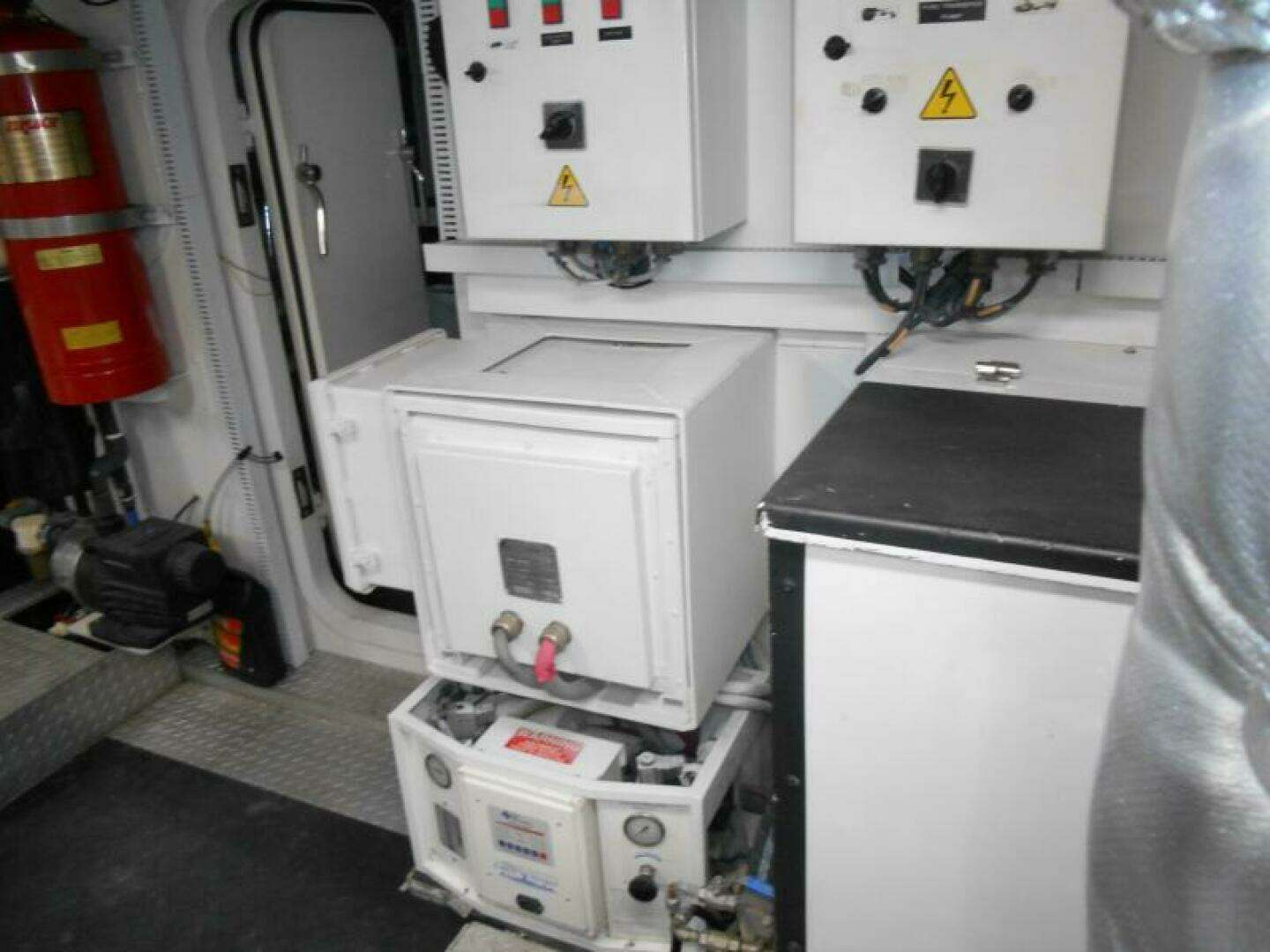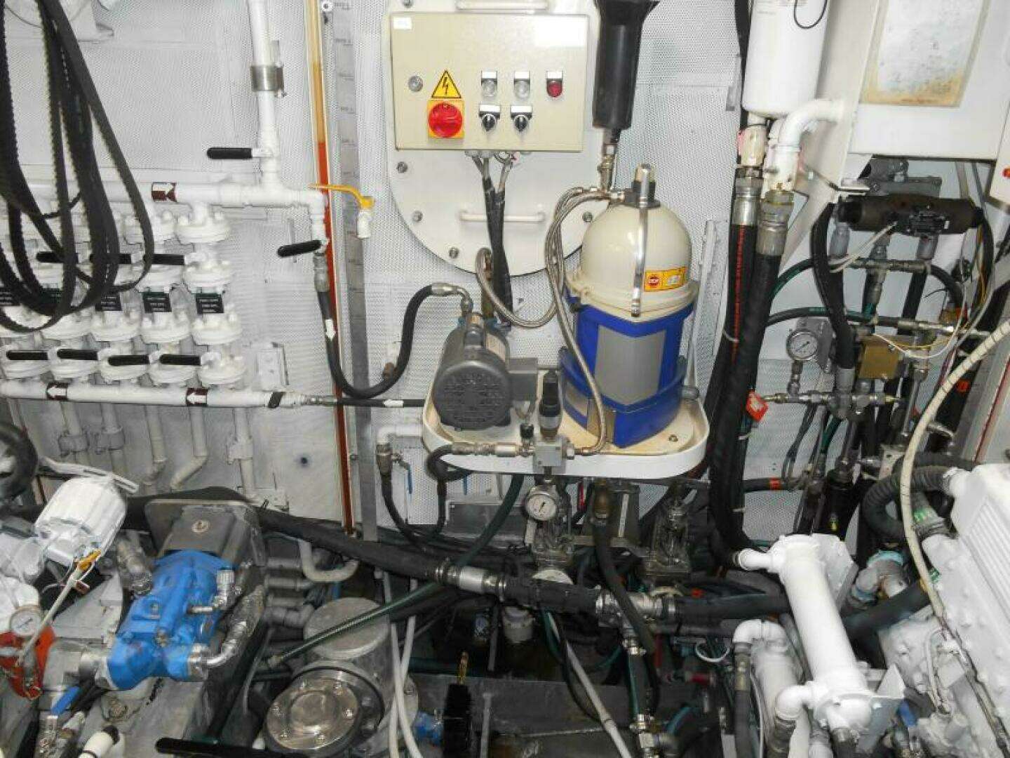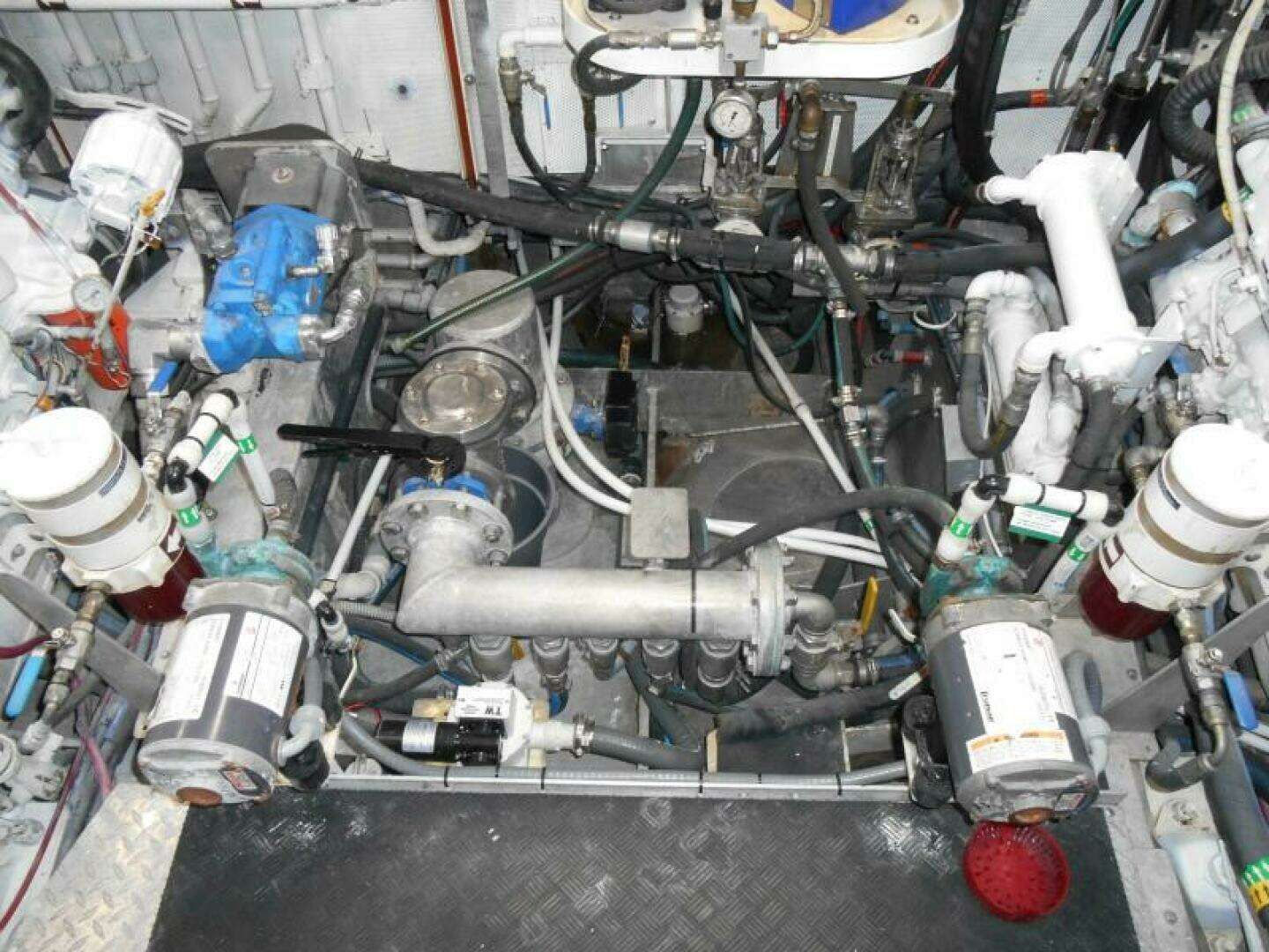 A spacious engine room with stand-up headroom makes easy access to all machinery, pumps, equipment, fuel manifolds and tankage. The fuel tanks are affixed athwartships across the beam of the engine room and are fitted with sight gages and manifolds.