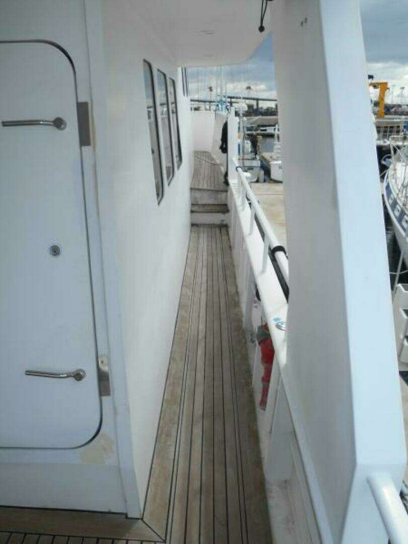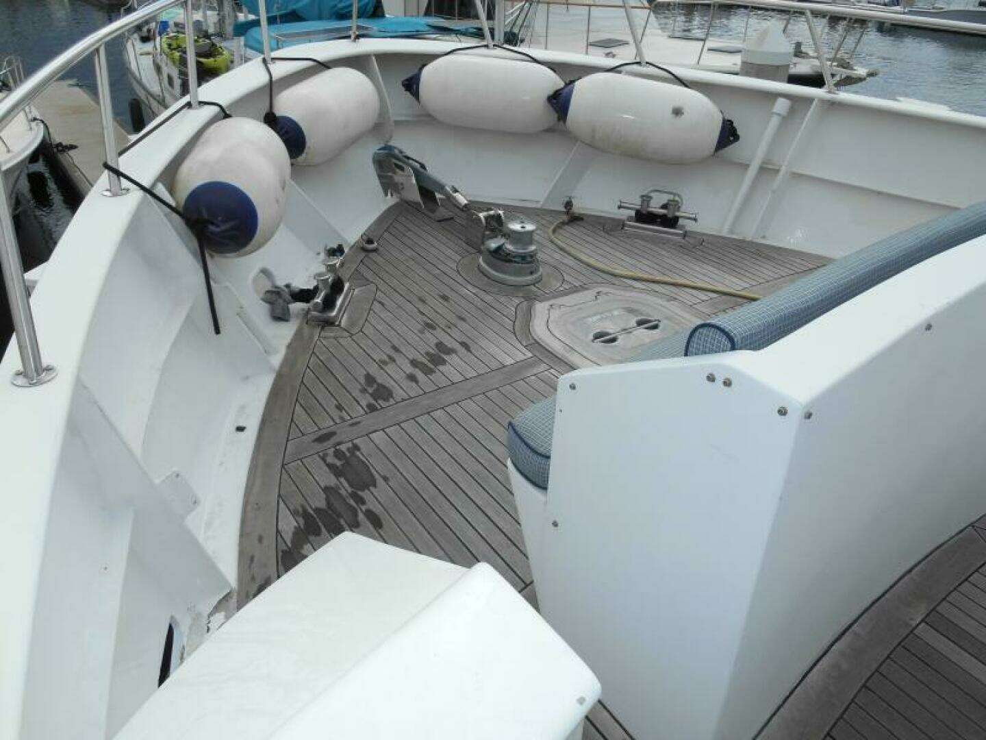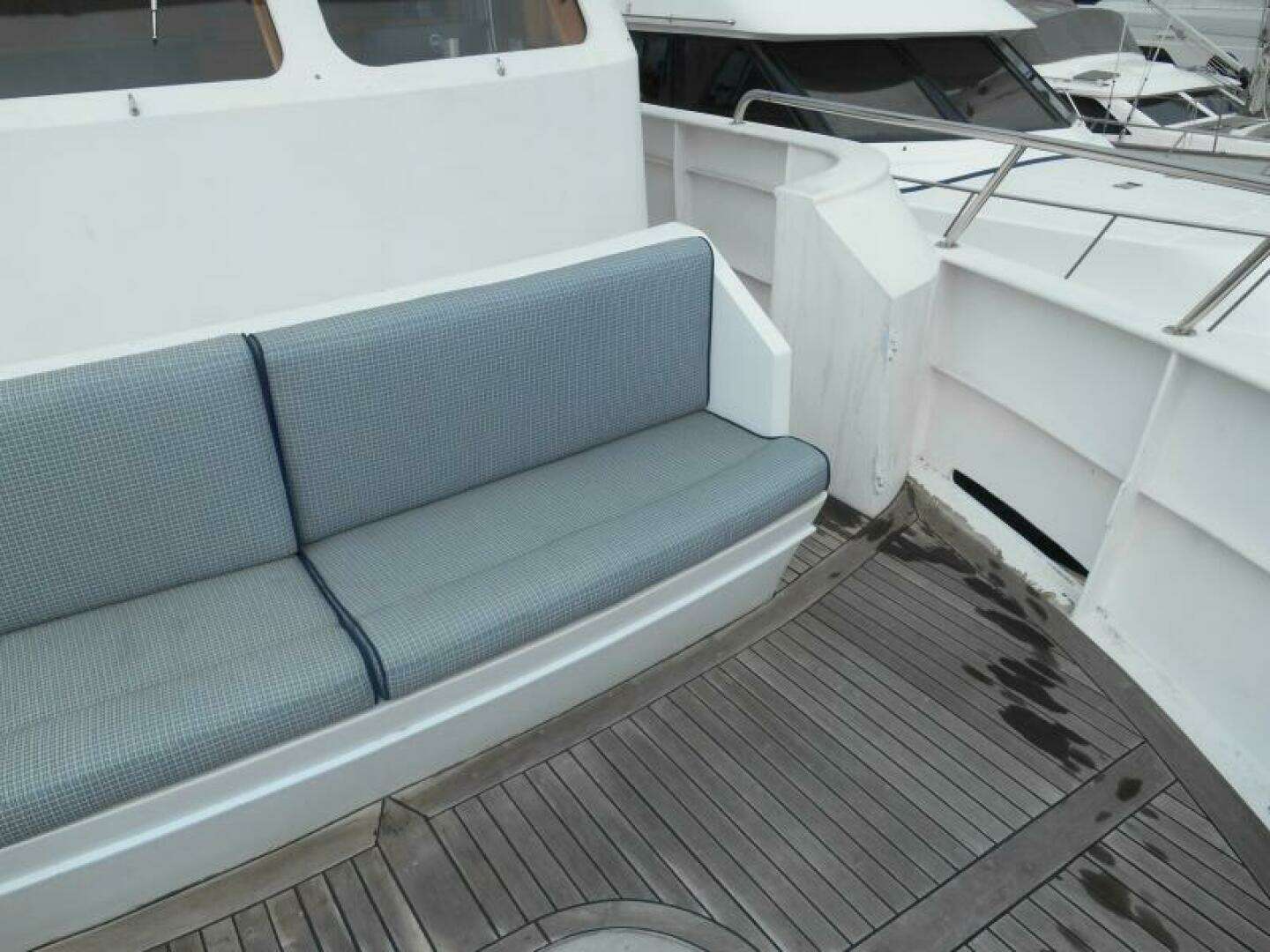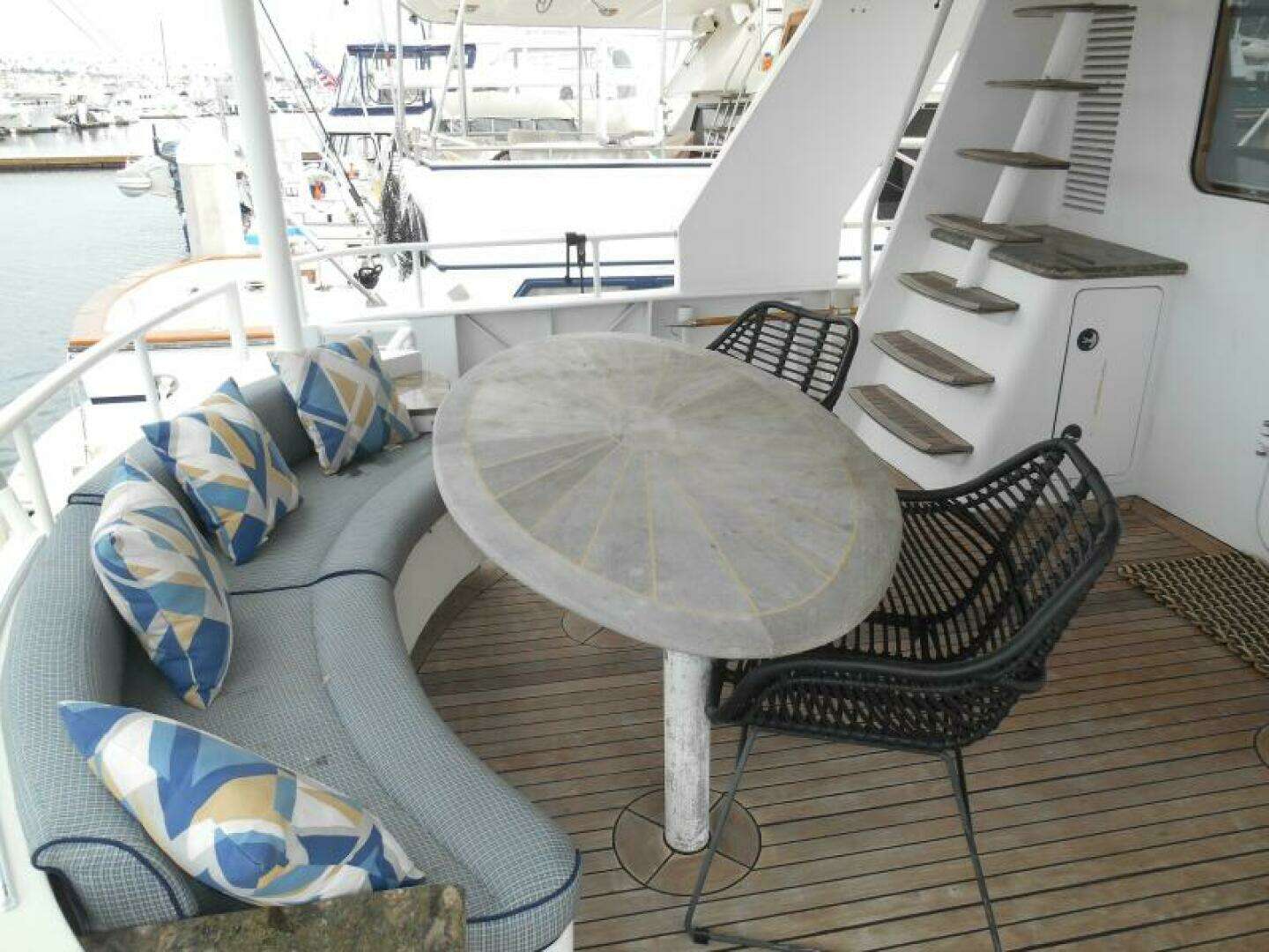 The Covered teak aft deck features circular lounge seating with Brazilian hardwood inlaid oval table. Stairwells port and starboard lead down to the large integrated swim platform with teak overlay. Storage lockers are located to Port and Starboard of the Salon entrance door while the stairway to the flybridge is to port. Engine room access is to Starboard through a watertight door or through a large starboard deck hatch.