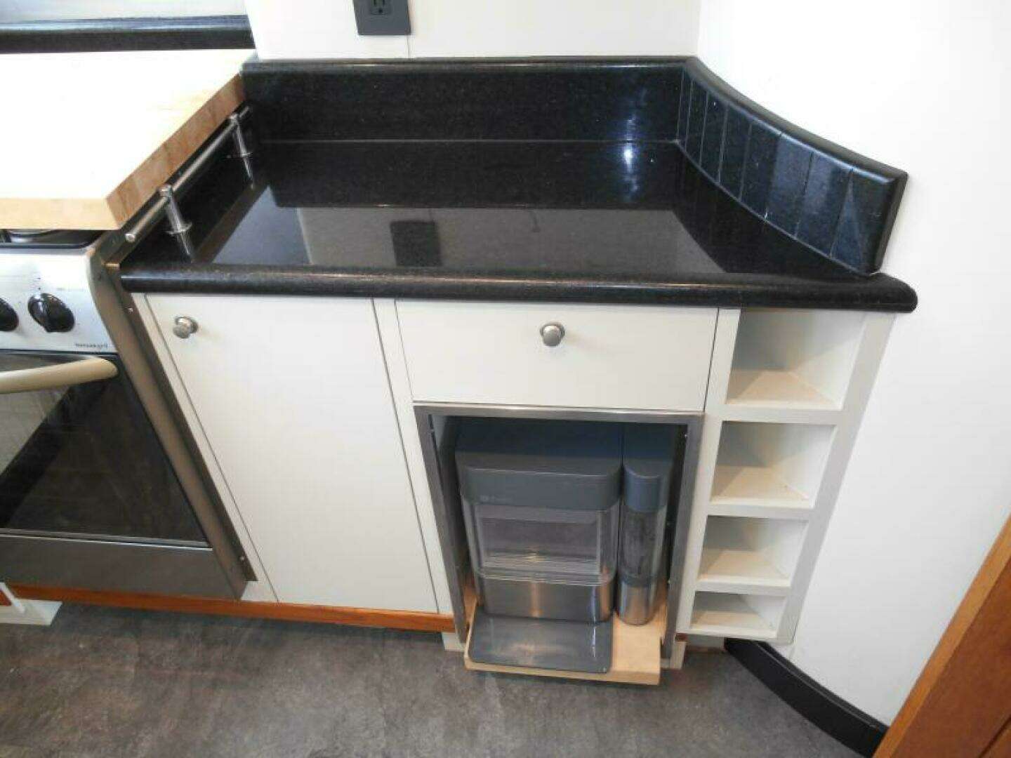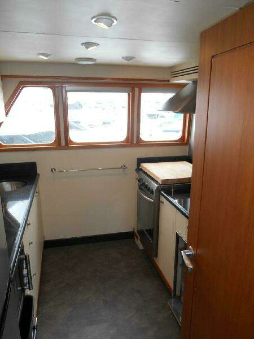 The Galley is forward of the salon located slightly to port of the passageway heading to the pilothouse. It has plenty of storage above and below, large marble counter tops facing both forward and aft. The galley was purposely oriented and designed to serve while underway or at anchor.