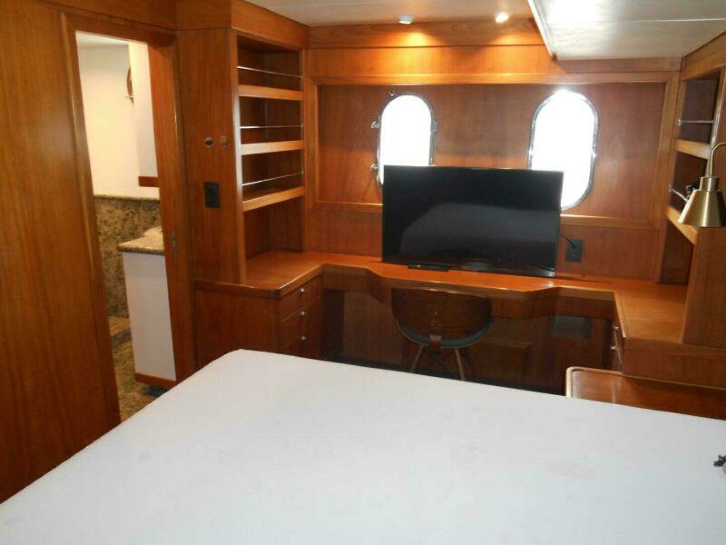 The Full-Beam Master Stateroom is located mid-ship for stability and comfort for the owners while under way. The cabin is surrounded in rich Brazilian Hardwood with built in settee, built in desk and shelving, Island Queen Bed. Large Stainless Steel Port Lights provide ample natural lighting to the stateroom with the closet located to port and en-suite forward to starboard with marble flooring and walls and glass enclosed shower.