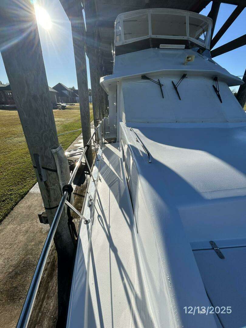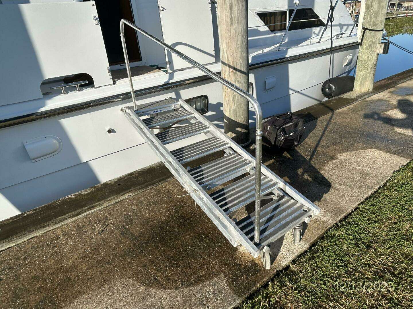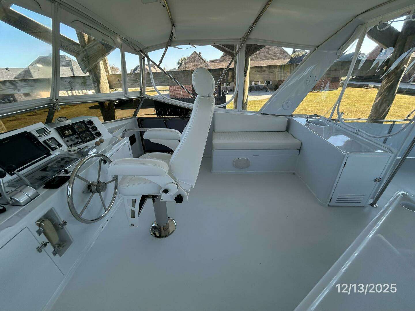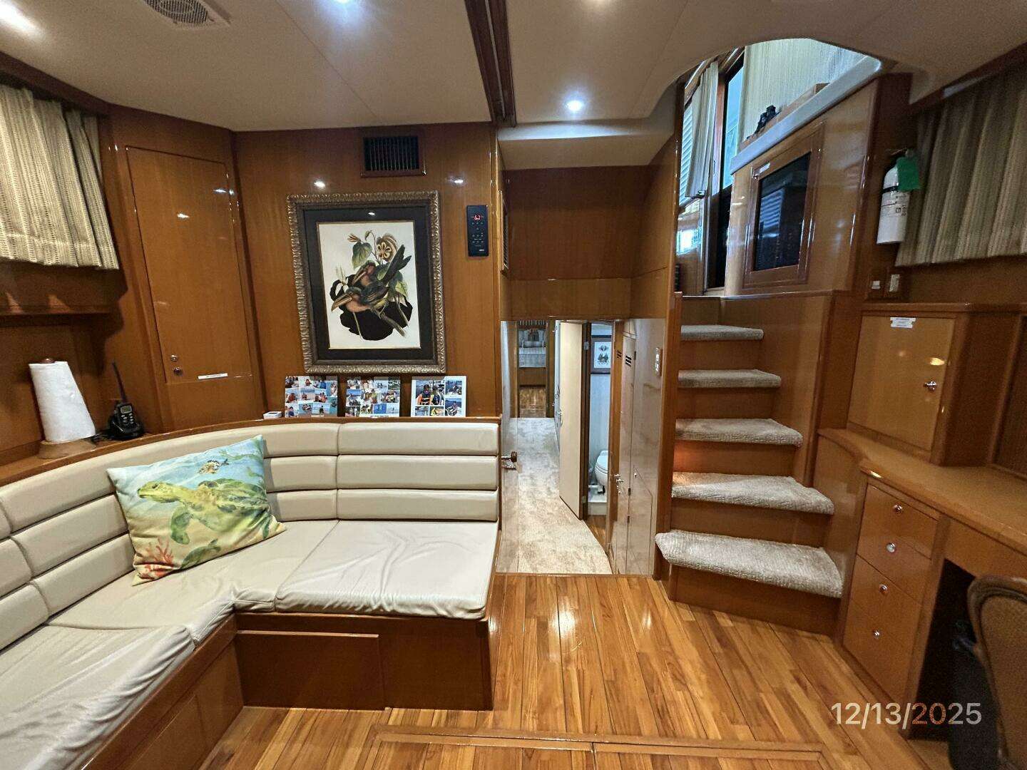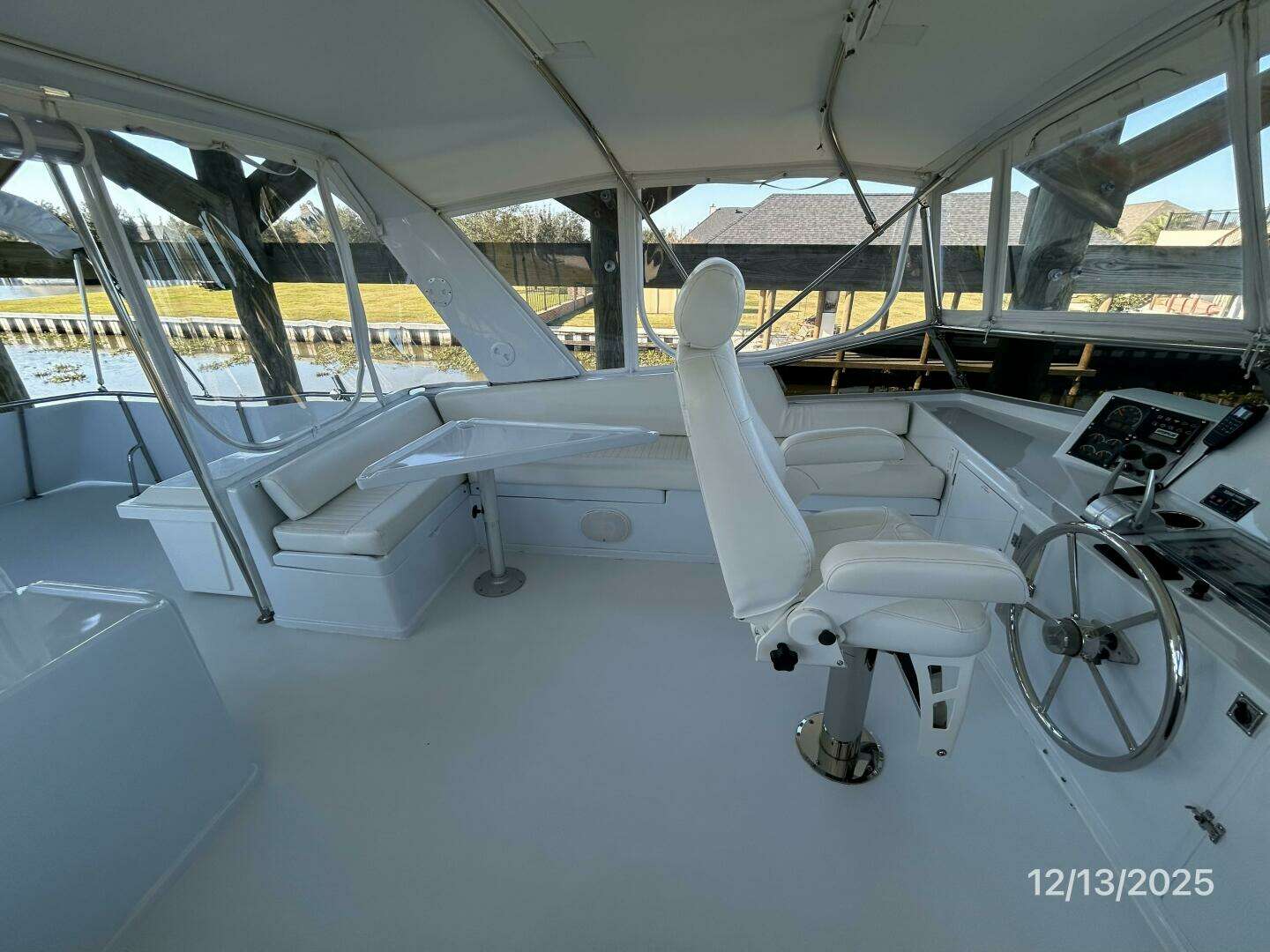 From the fiberglass swimplatform, you enter the cockpit via the port side transom gate. From the cockpit, you step up 5 molded-in steps to the hardtop covered aftdeck. From the aftdeck, you step into the salon via the sliding door and find the galley starboard aft, dinette port aft, sofa and coffee table port forward, two chairs and a table to starboard and entertainment center and storage forward. Continue forward into the pilothouse and find a side deck access door on each side, helm forward, helm benchseat aft and internal stairs to the flybridge starboard aft. Step down the port forward stairs into the office with a desk to port and seating (Converts into a double size berth) and storage to starboard. Walk forward into the guest stateroom with an island queen size berth and ensuite head with enclosed shower, or walk aft via the companionway to find a guest stateroom with side by side single size berths to starboard and guest head with enclosed shower to port. Continue aft to find an engine room on each side and then all the way aft the the full-beam master stateroom with a centerline king size berth and ensuite head with an enclosed shower. New carpet and wallpaper was installed in 2023.