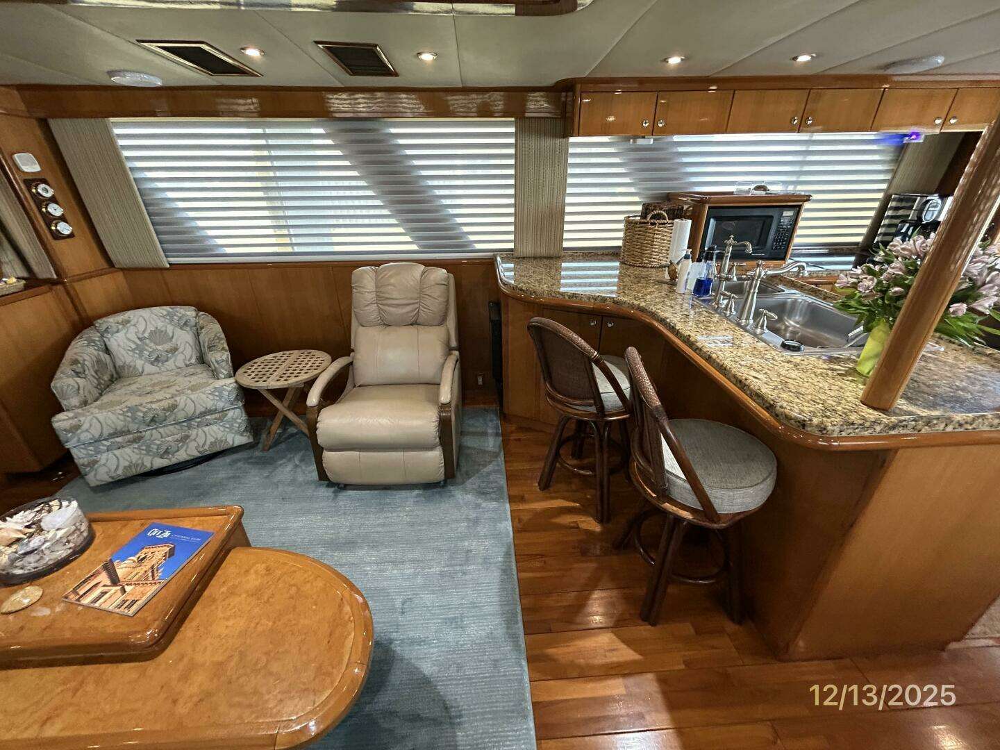 The salon offers a sofa and coffee table to port, 2 chairs and a table to starboard, entertainment center, refrigeration and storage forward, opening side windows with screens and blinds, galley countertop with two bar stools starboard aft, a dinette with a hi/lo folding table port aft and engine room access.