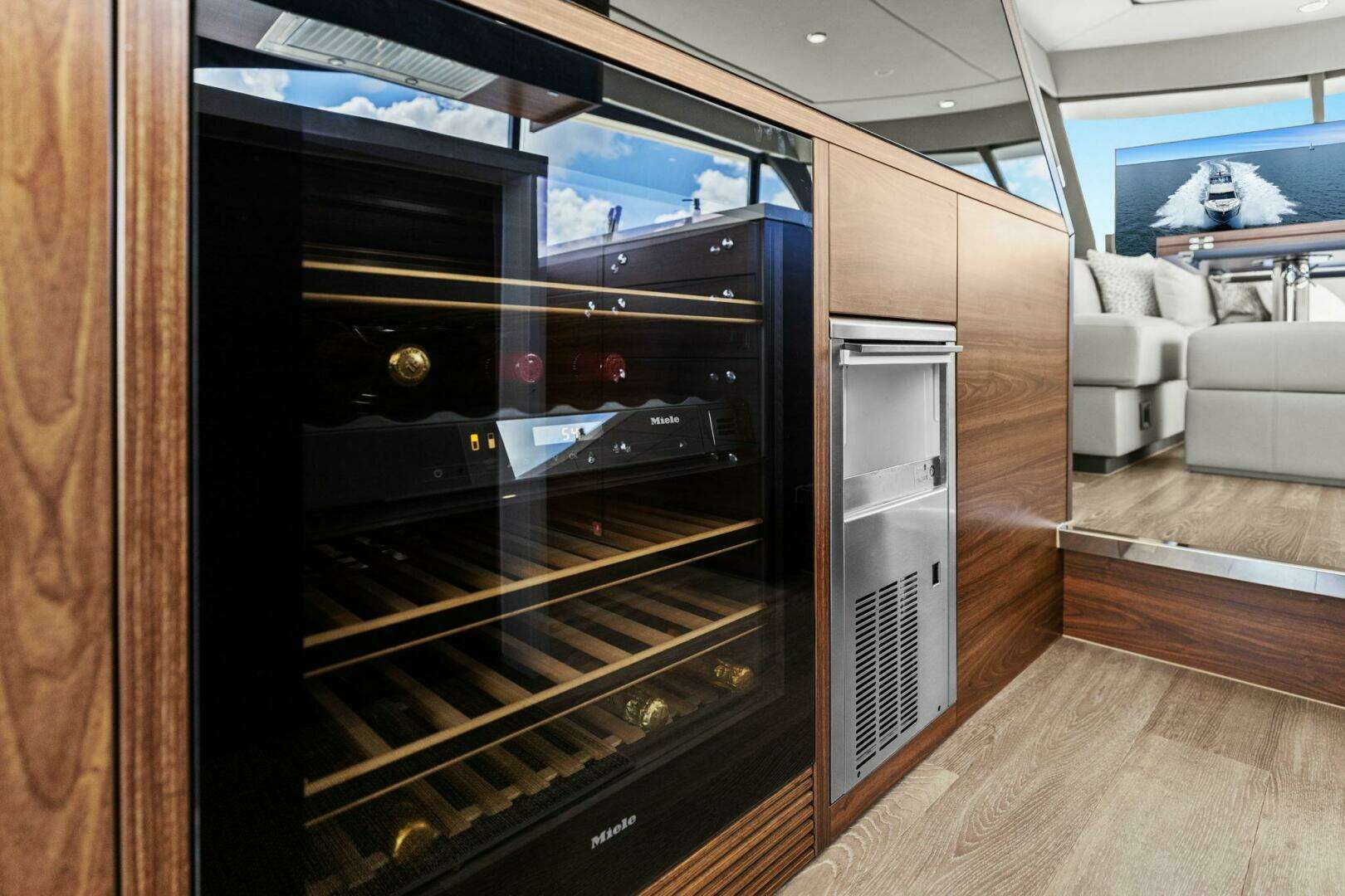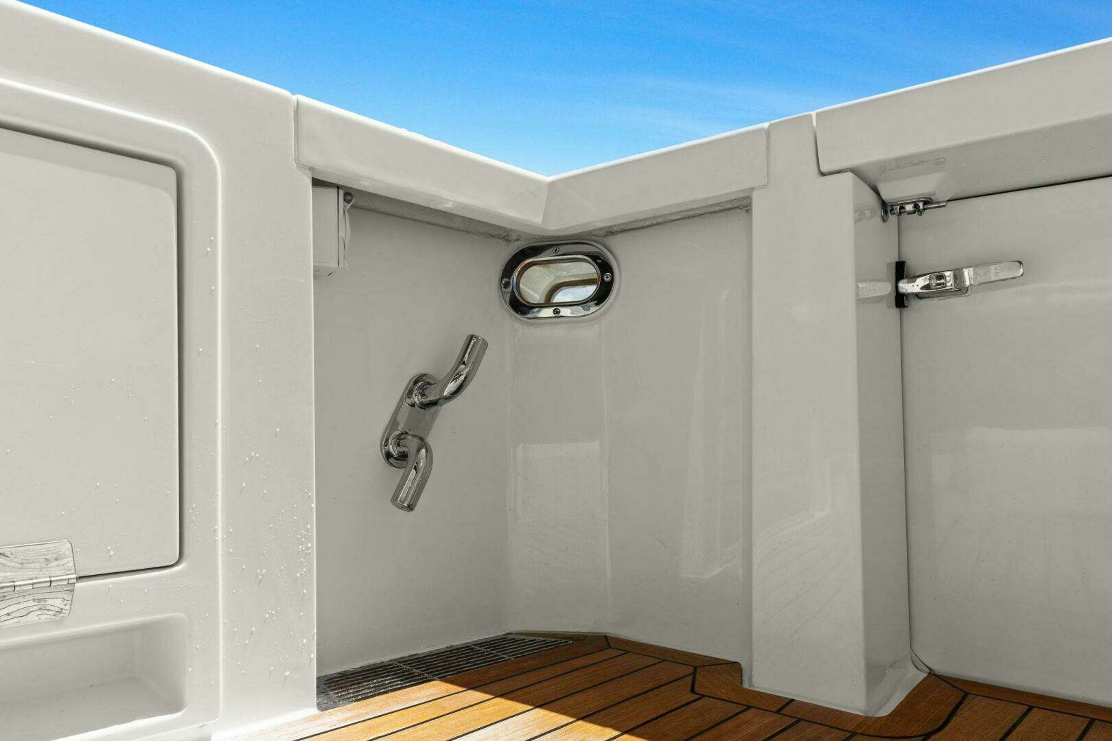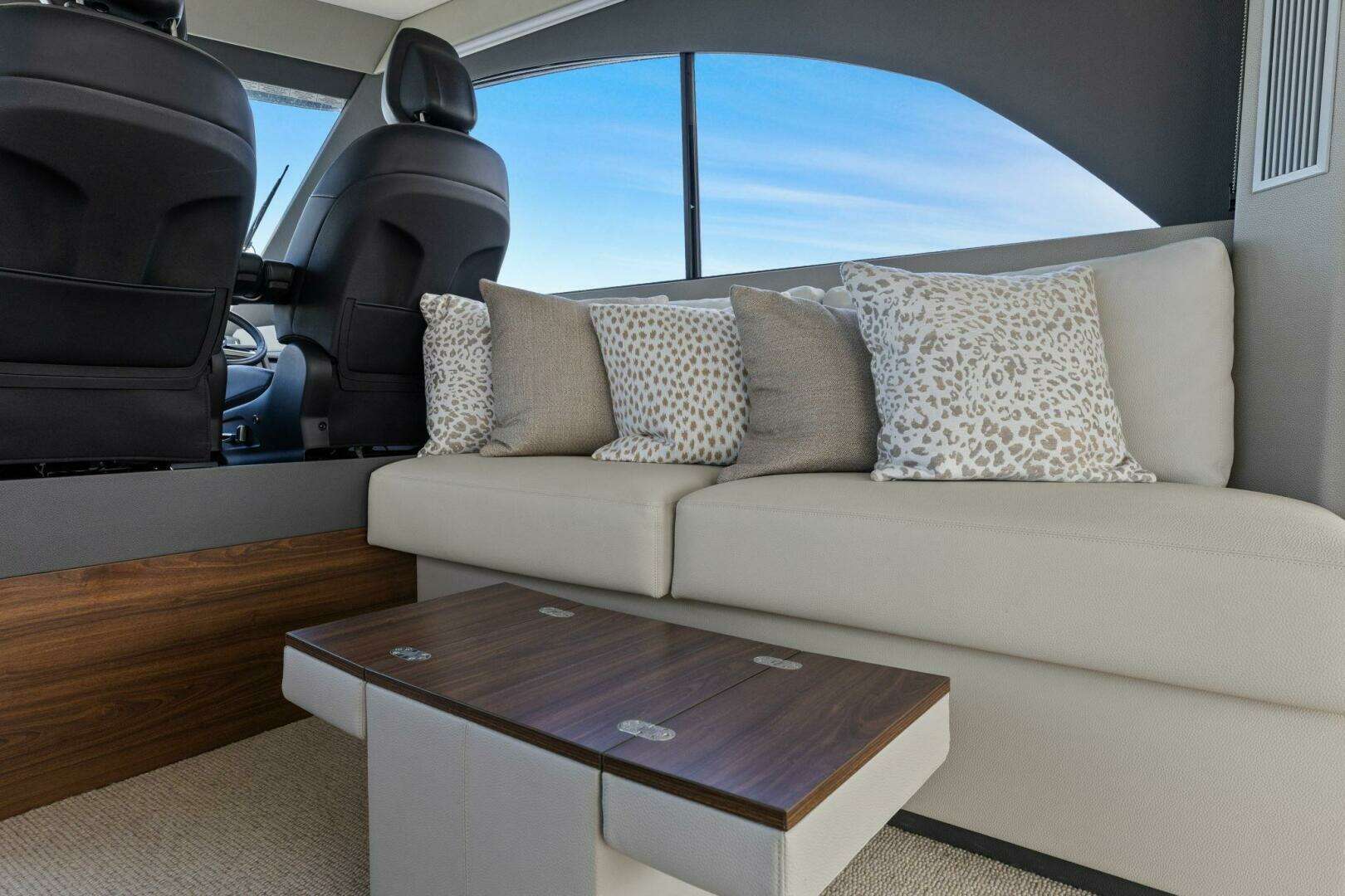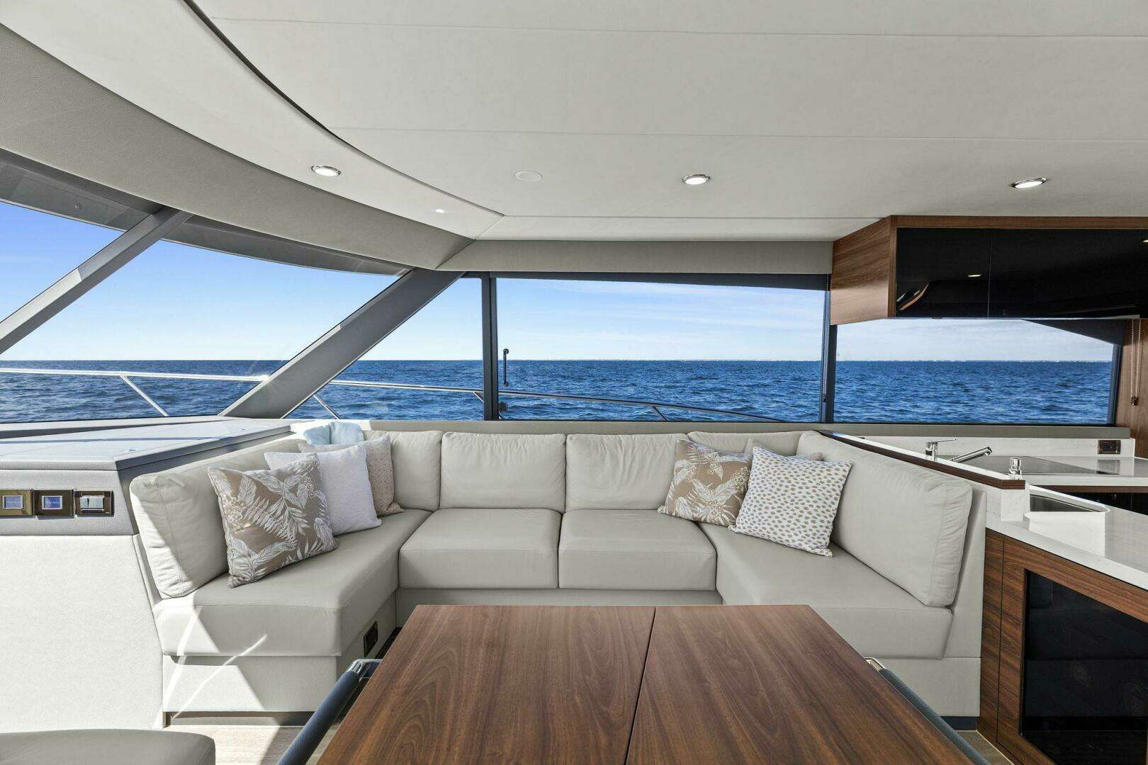 - Flybridge: Extended aft, U-shaped lounge seating, balcony outlet, stereo speakers, aft drop cover