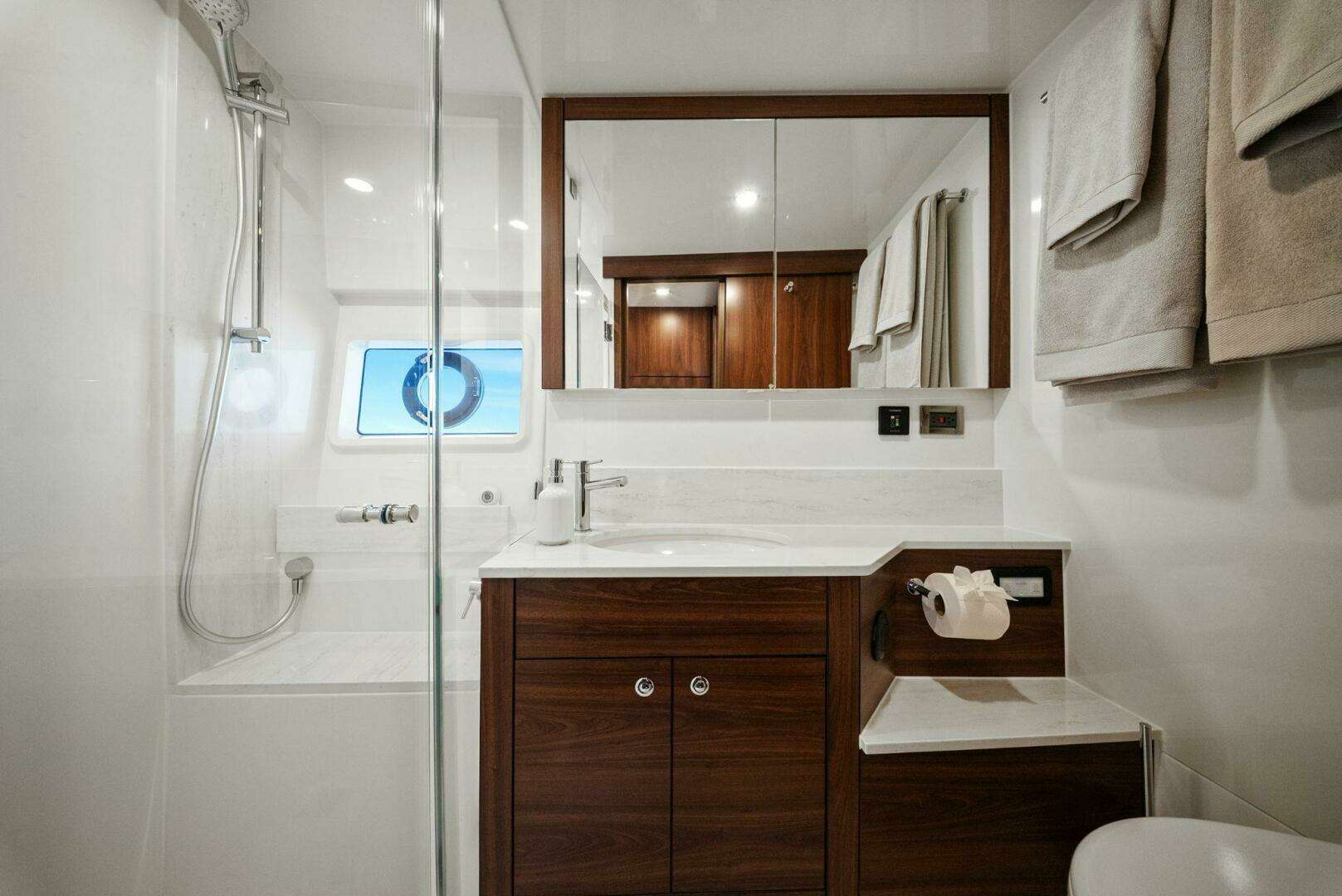 - Guest bathroom - shared with companionway - fresh water flush toilet, shower with automatic pump, frameless glass shower screen, vanity with mirror, LED down lights, solidsurface bench top, deck hatch with blind, towel rails and robe hooks