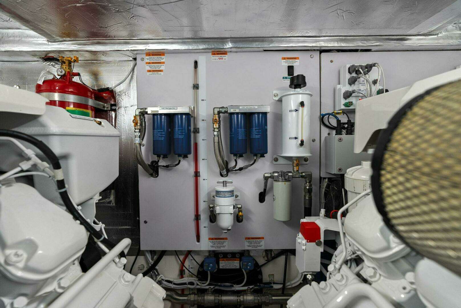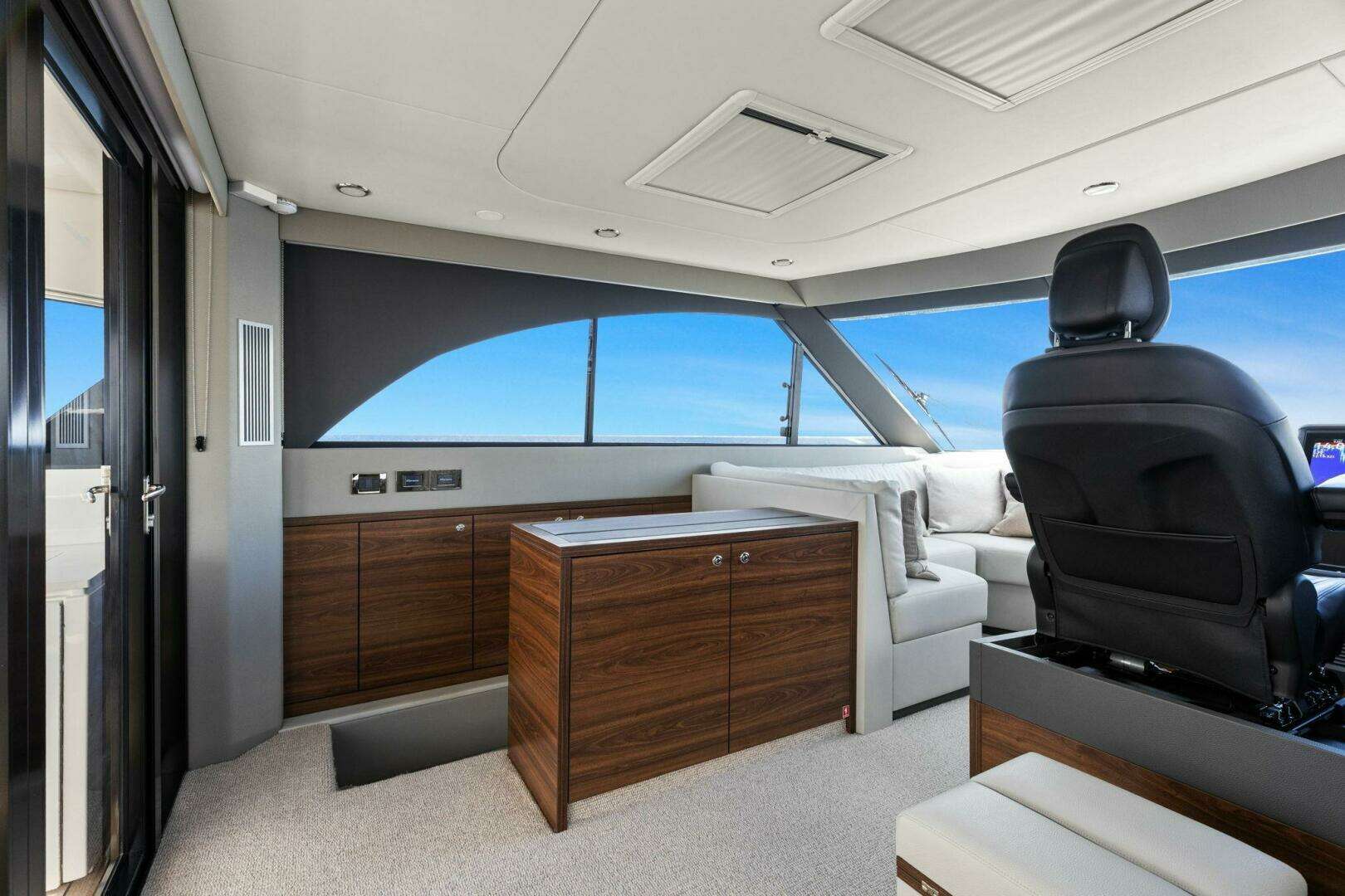 - Cockpit: Extended, Custom U-shaped seating with table, chaise lounge ottomans, side boarding gates, thruster and engine controls, aft drop cover