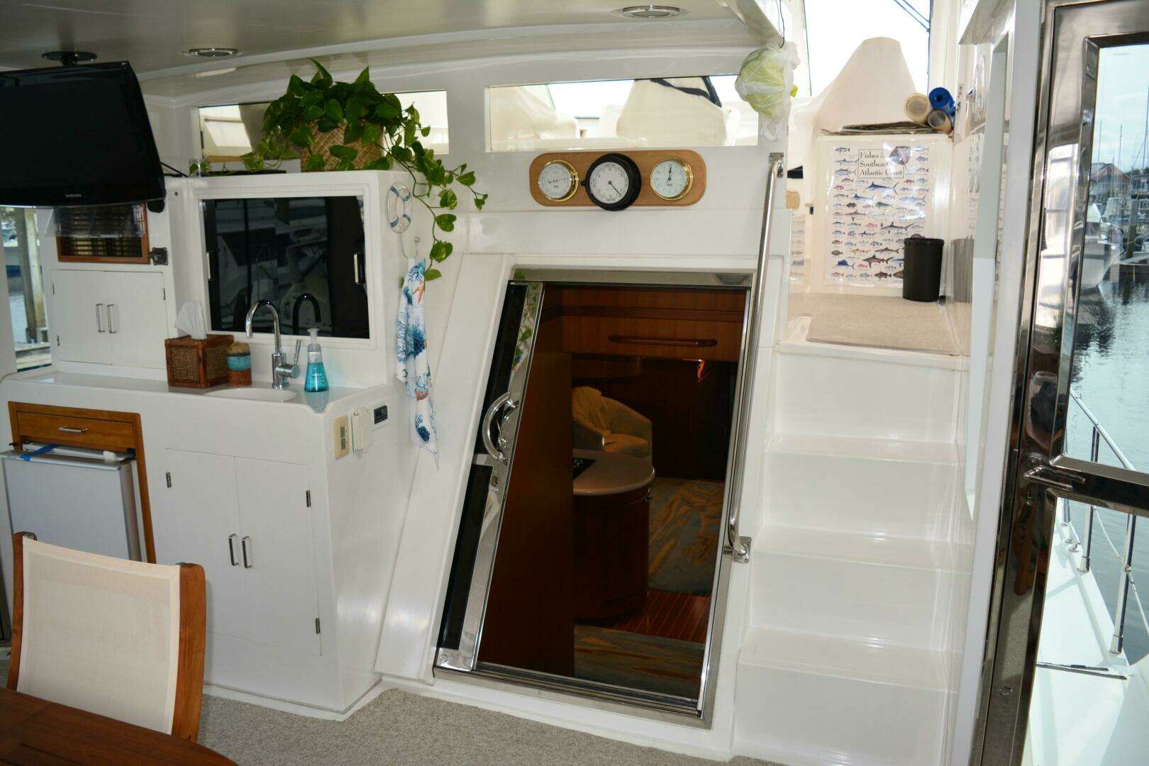 The boat's interior is clean and spacious, beautiful teak and cherry cabinetry and teak-and-holly sole throughout.