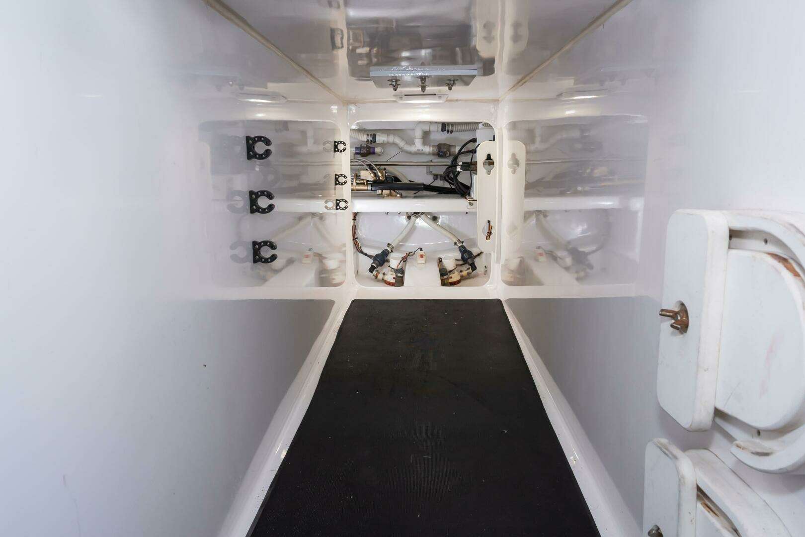 Companionway tackle storage room with rod storage and shelves for additional tackle storage