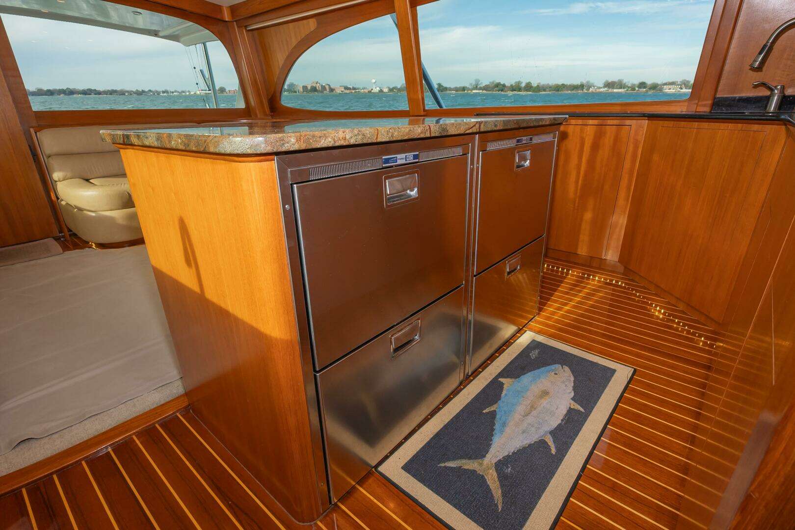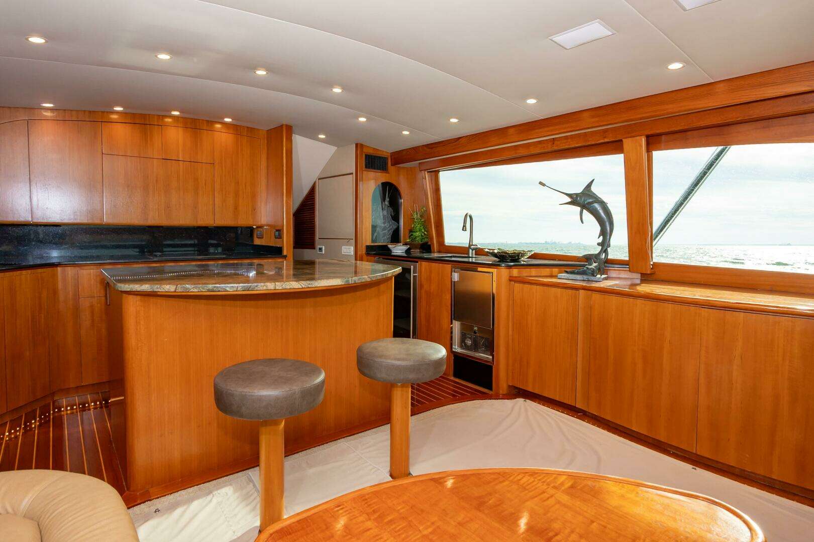 Take Em was designed and built for owners who value simplicity and ease of maintenance without compromising elegance. The teak cabinetry is a perfect example of this. The galley island and bar stools are designed for the casual life of the sportfish enthusiast.