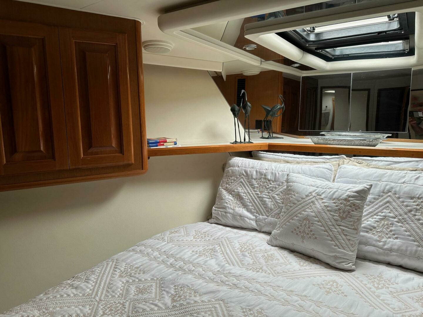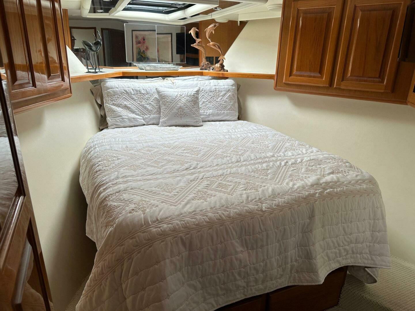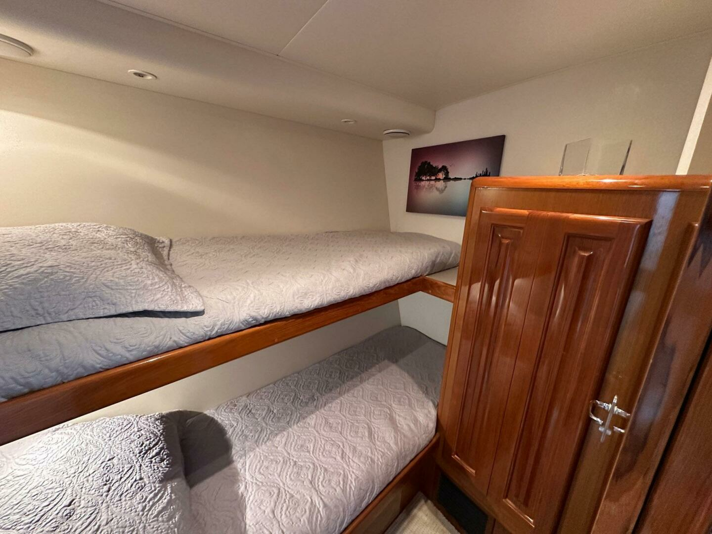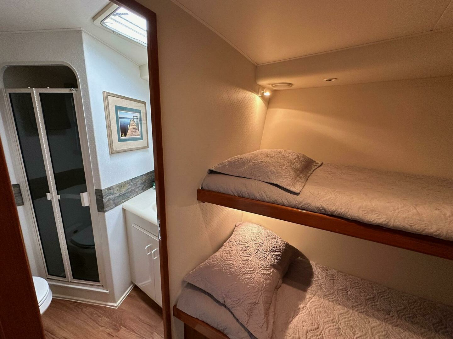 Forward VIP stateroom offers excellent accommodations with a centerline berth, beautiful Teak raised panel cabinets and private head. This stateroom rivals the master for comfort and layout.