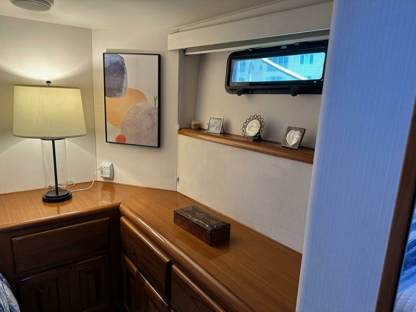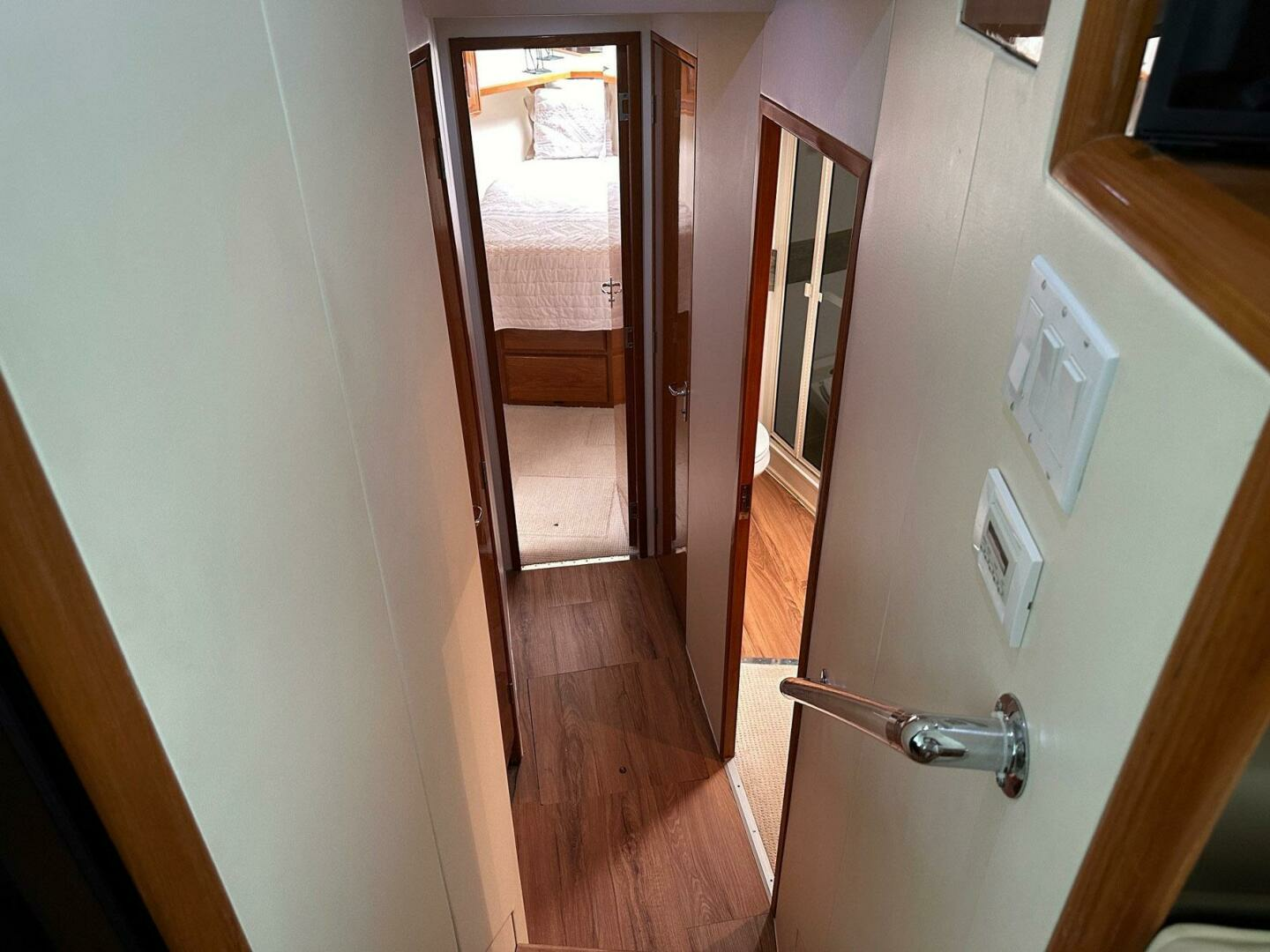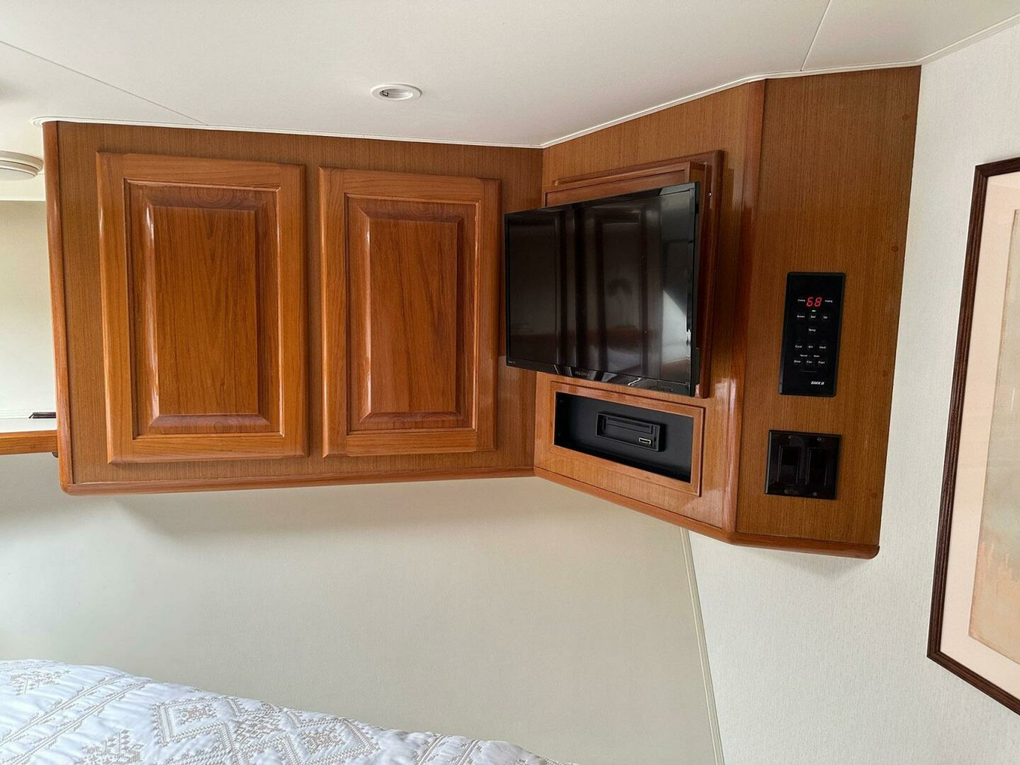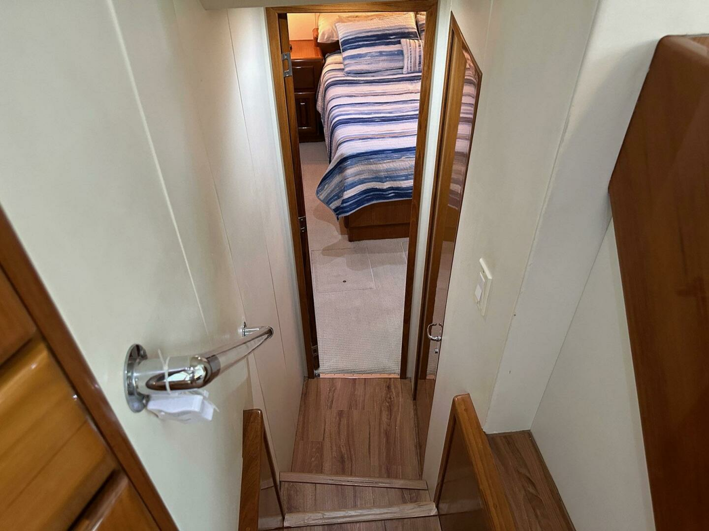 Forward VIP stateroom offers excellent accommodations with a centerline berth, beautiful Teak raised panel cabinets and private head. This stateroom rivals the master for comfort and layout.