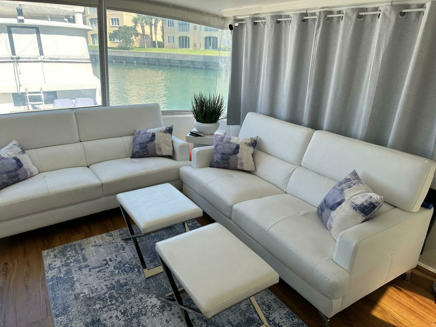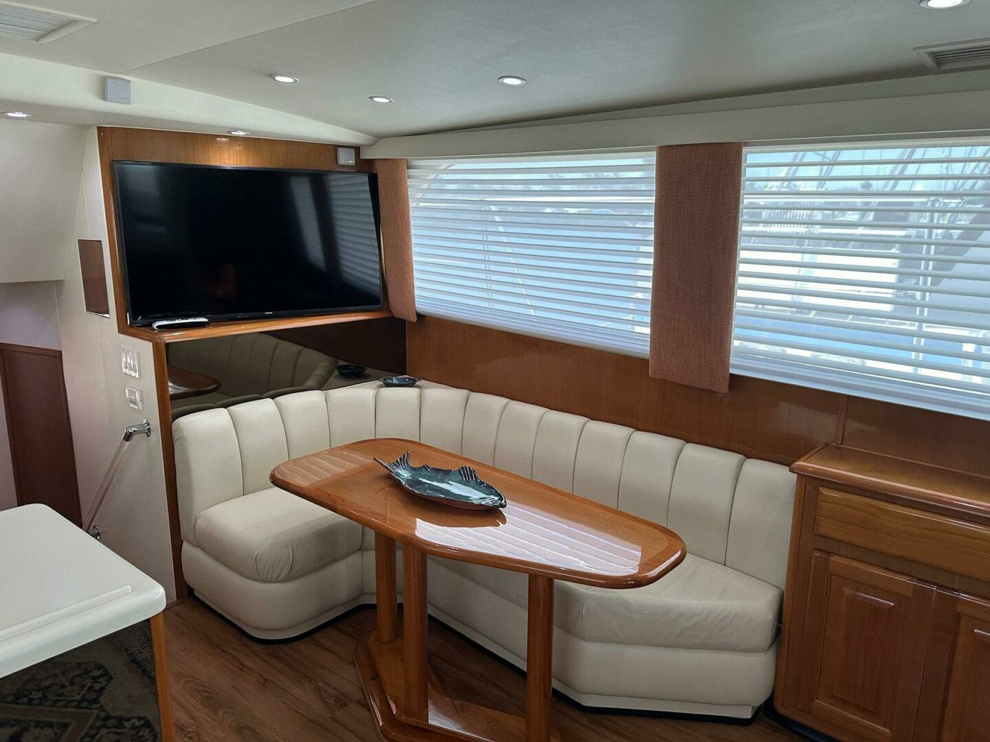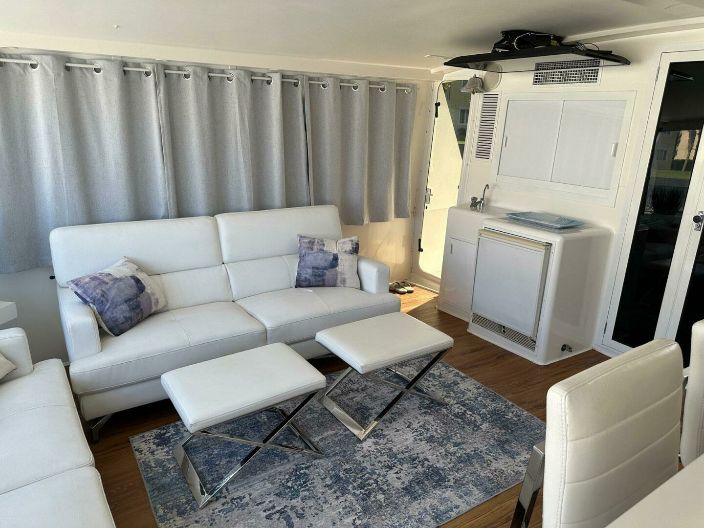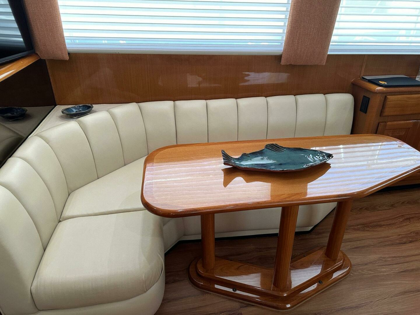 Salon is open and airy with large windows and custom blinds and cornices. Open to the galley and offering comfortable sofa and dinette seating for entertaining.