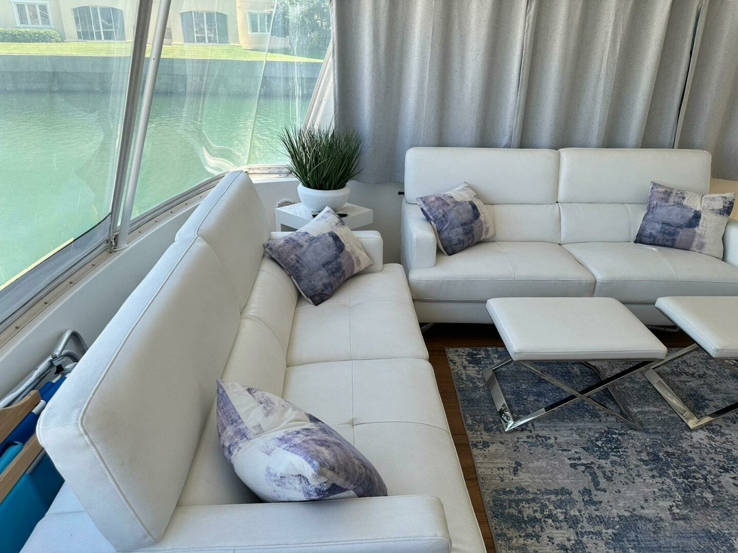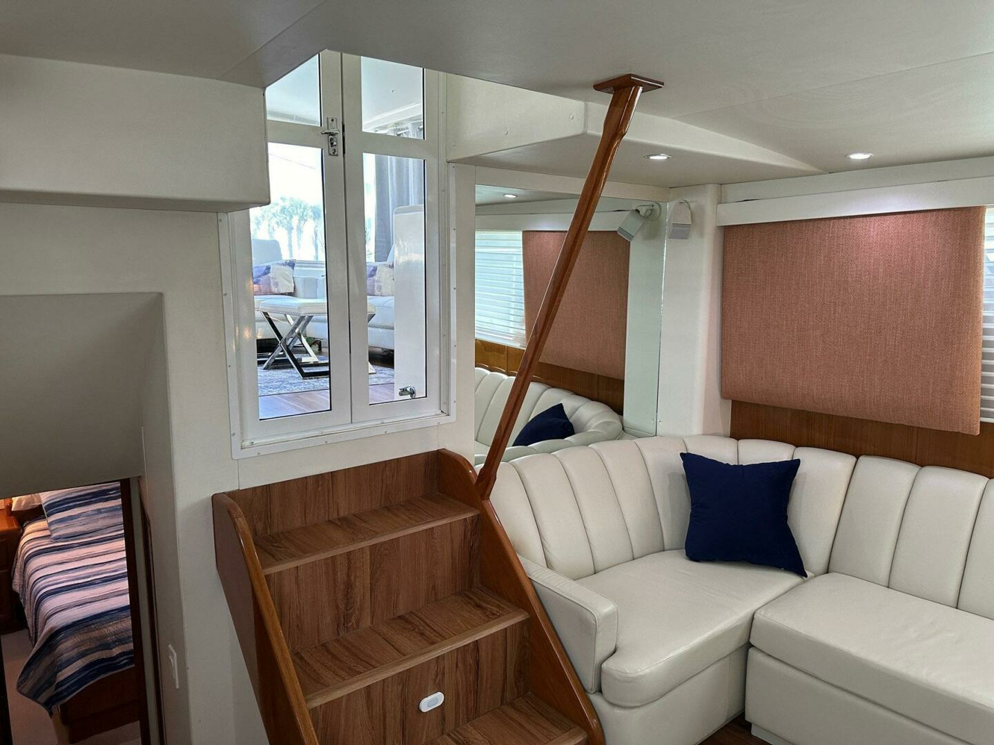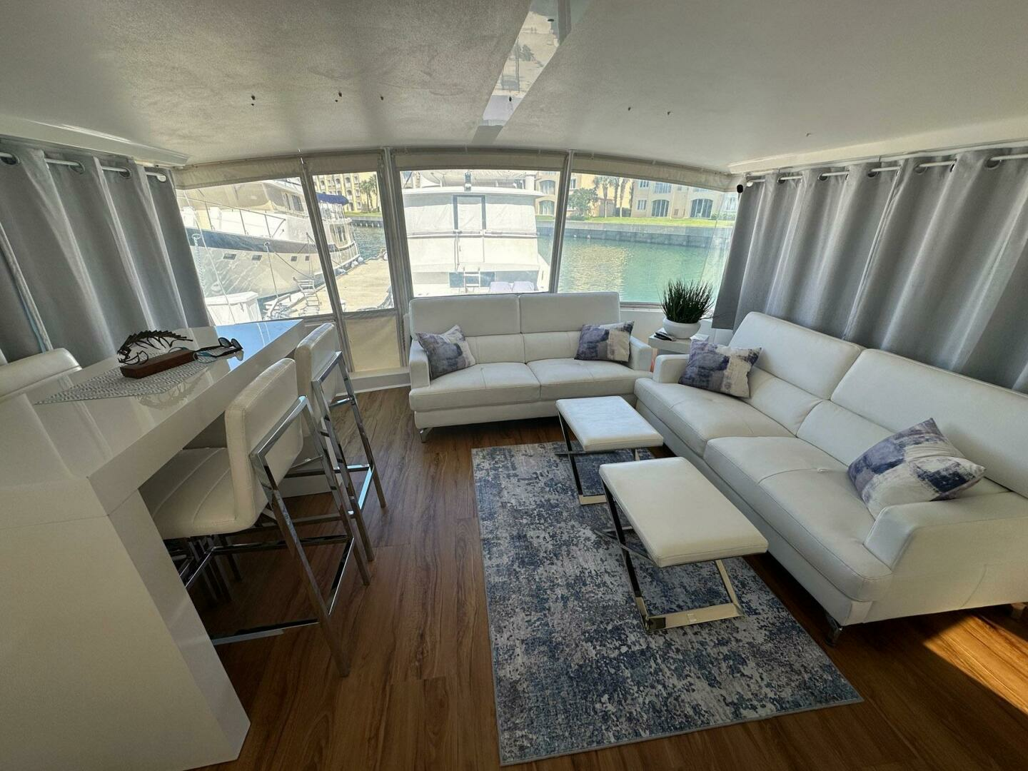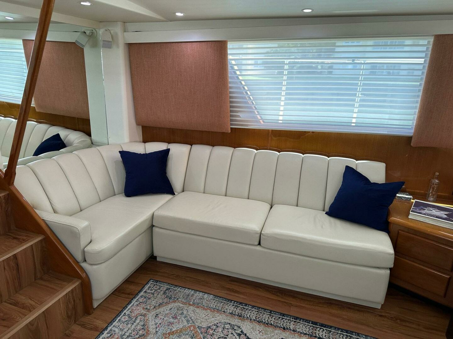 Salon is open and airy with large windows and custom blinds and cornices. Open to the galley and offering comfortable sofa and dinette seating for entertaining.