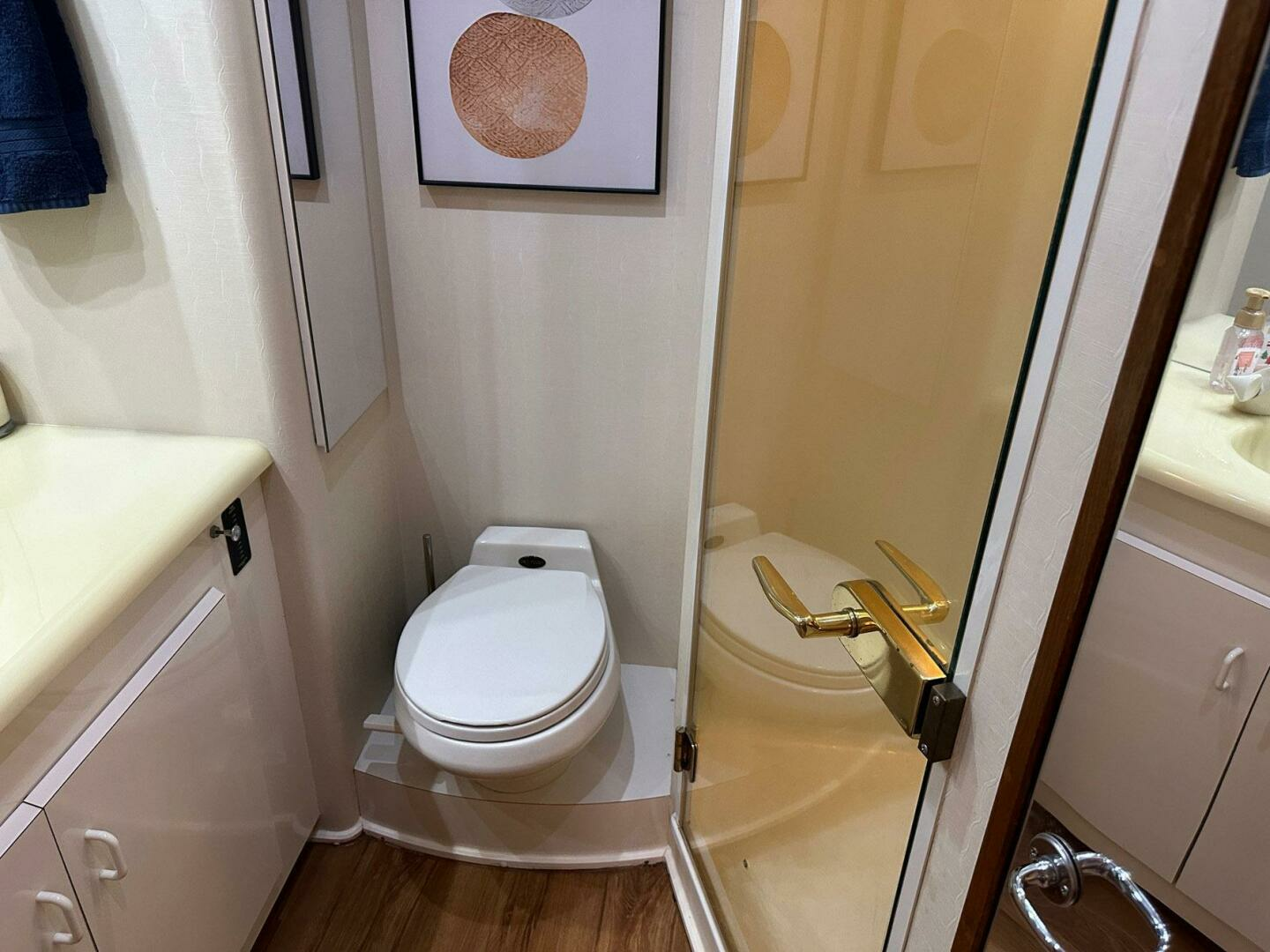 - Access to en-suite head with Corian style counter tops, enclosed shower with plexiglass door and Vacu Flush toilet