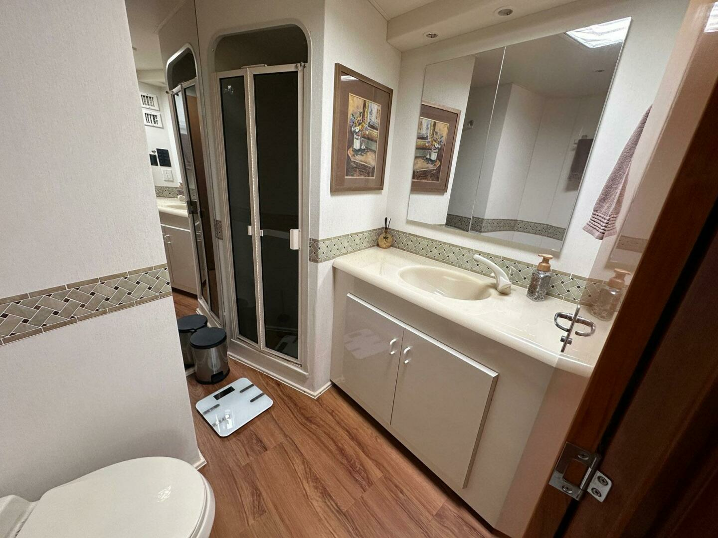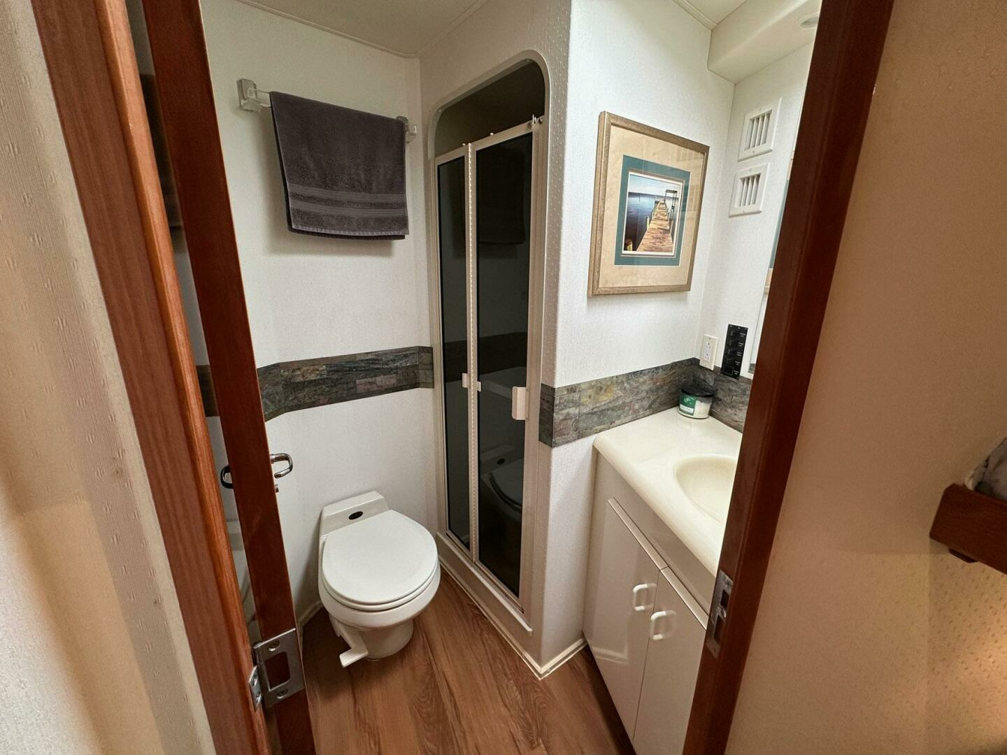 - Access to day head which includes a stall shower, molded countertop and sink, overhead hatch and Vacu-Flush toilet