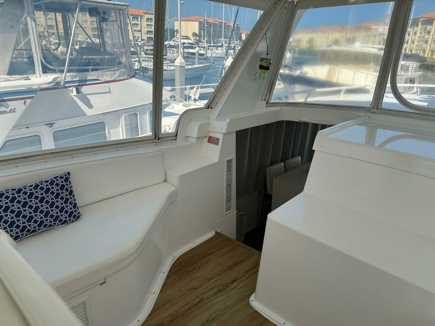 Huge flybridge with full glass windshield forward for weather protection. Fully enclosed and air conditioned offering excellent visibility and full array of electronics.