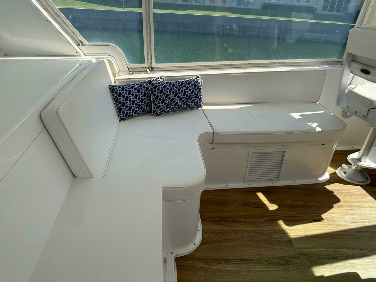 - L-Shaped dinette seating for four with Teak table to starboard