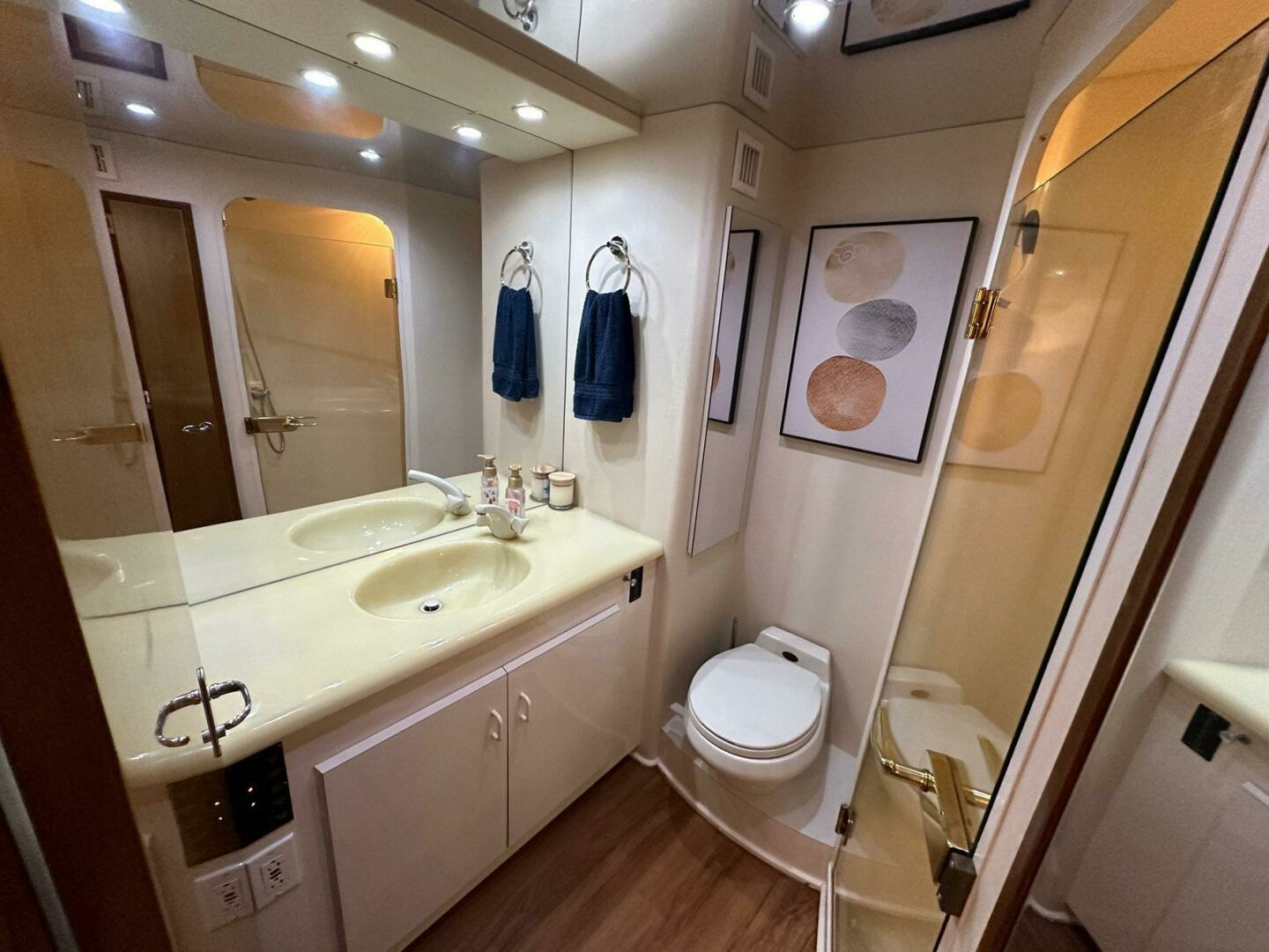 Large master stateroom offers queen bed, hanging lockers, and ample drawer and cabinet storage. Oversized private head with stall shower and molded countertops.