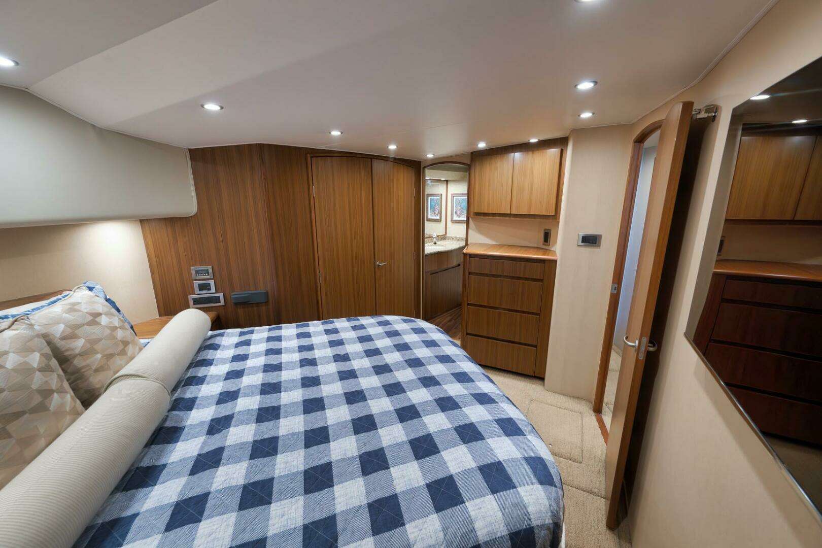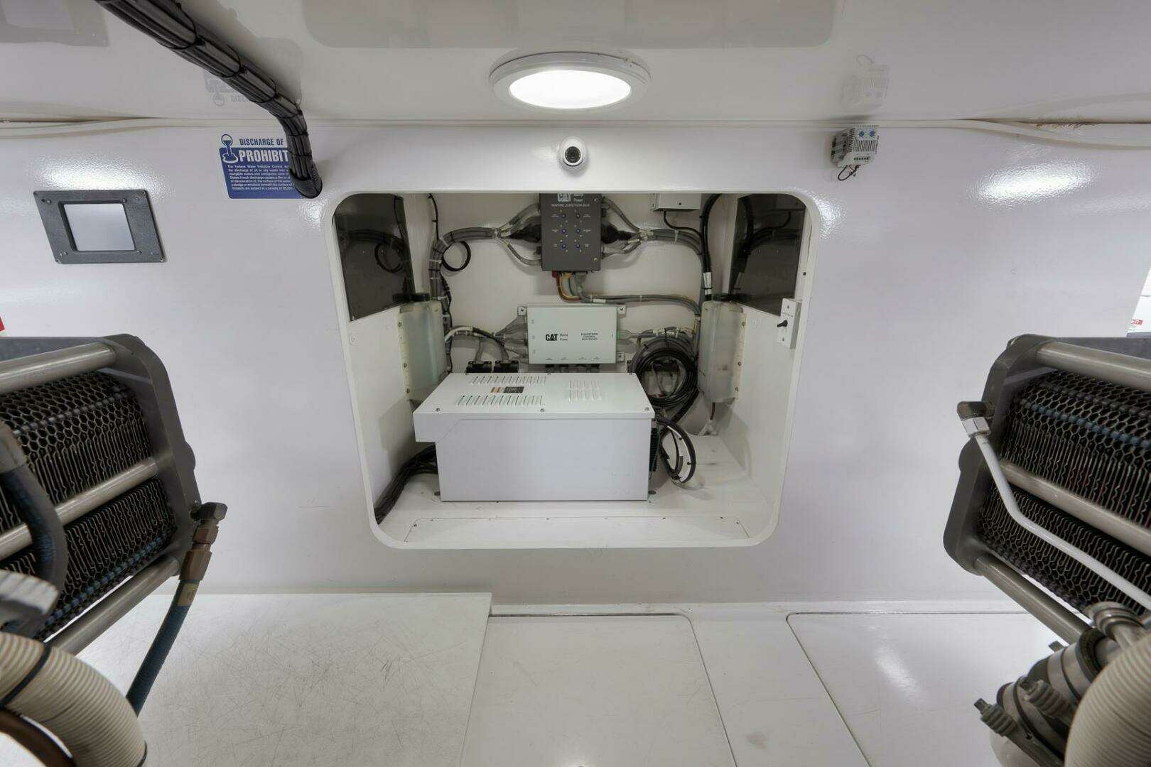 Engine room access and maneuverability is a breeze on the Even Flow due to the effective layout. To both port and starboard are CAT C32 Acerts along with twin Cummins Onan generators. The motors can be accessed both centerline and to the exterior of each engine making a service or diagnosis a simple process. Forward of the motors to both port and starboard houses two separate pump rooms containing AC access, water maker access, and additional systems. The engine room layout on the 60' Viking is the epitome of what a neat, organized engine room should resemble.