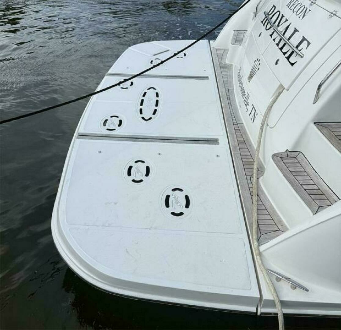 DENA GAIL offers an unparalleled culmination of options, cleanliness, style, performance, and comfort. She has a teak covered hydraulic swim platform and teak steps on both port and stbd that lead to the large teak cockpit. The transom locker provides exceptional storage. Entry gates can be found on both the port and stbd side. The teak is in great condition. In the most aft portion of the cockpit is a bench seat that converts to an electrically actuated fold out sunpad. The cockpit area offers great seating, plenty of room for everyone, a table, an icemaker, a grill, and a refrigerator. Molded steps covered with teak on both the port and stbd side give access to the side decks.