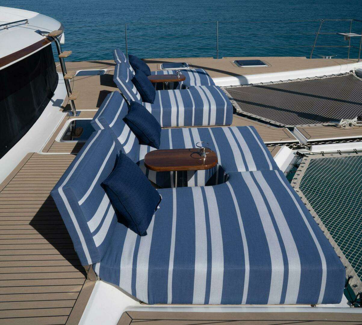 On the starboard side, the master suite has also been substantially modified, with a washroom now placed aft on either side of the cockpit access stairs, making room for a large cupboard space in the bedroom. The forward starboard cabin, now a real V.I.P. suite, also benefits from this change due to the volume freed up by the repositioning of the master washroom.