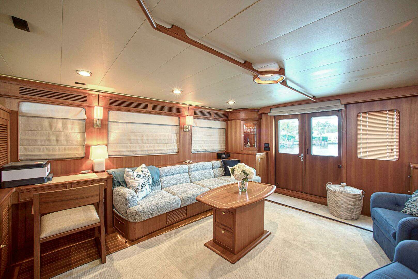 Upon entering the salon, you are immediately struck by the beautiful interior, hand-crafted teak and holly high-gloss floors, and customized teak cabinetry with opulent interior upgrades. The impeccable teak and holly sole and satin-finish teak cabinetry impart a warm, inviting, yet lavish feeling that carries through to every space on the yacht. There is a desk built into the forward corner, complete with a file drawer, so one can work with a view, if necessary while cruising. Upgraded top-of-the-line fabrics and finishes Custom Roman Shade Venetian blinds Solid teak and holly sole Subzero UC-24 beverage center and ice maker Subzero wine cooler Large Samsung LED flat screen high-definition SAT TV mounted discretely behind custom teak tambour doors Custom teak table with storage beneath Two aft opening doors to cockpit