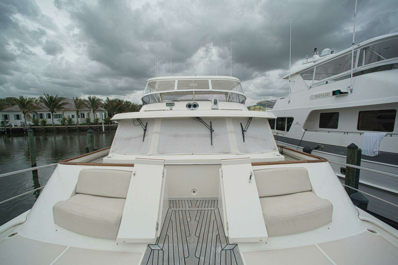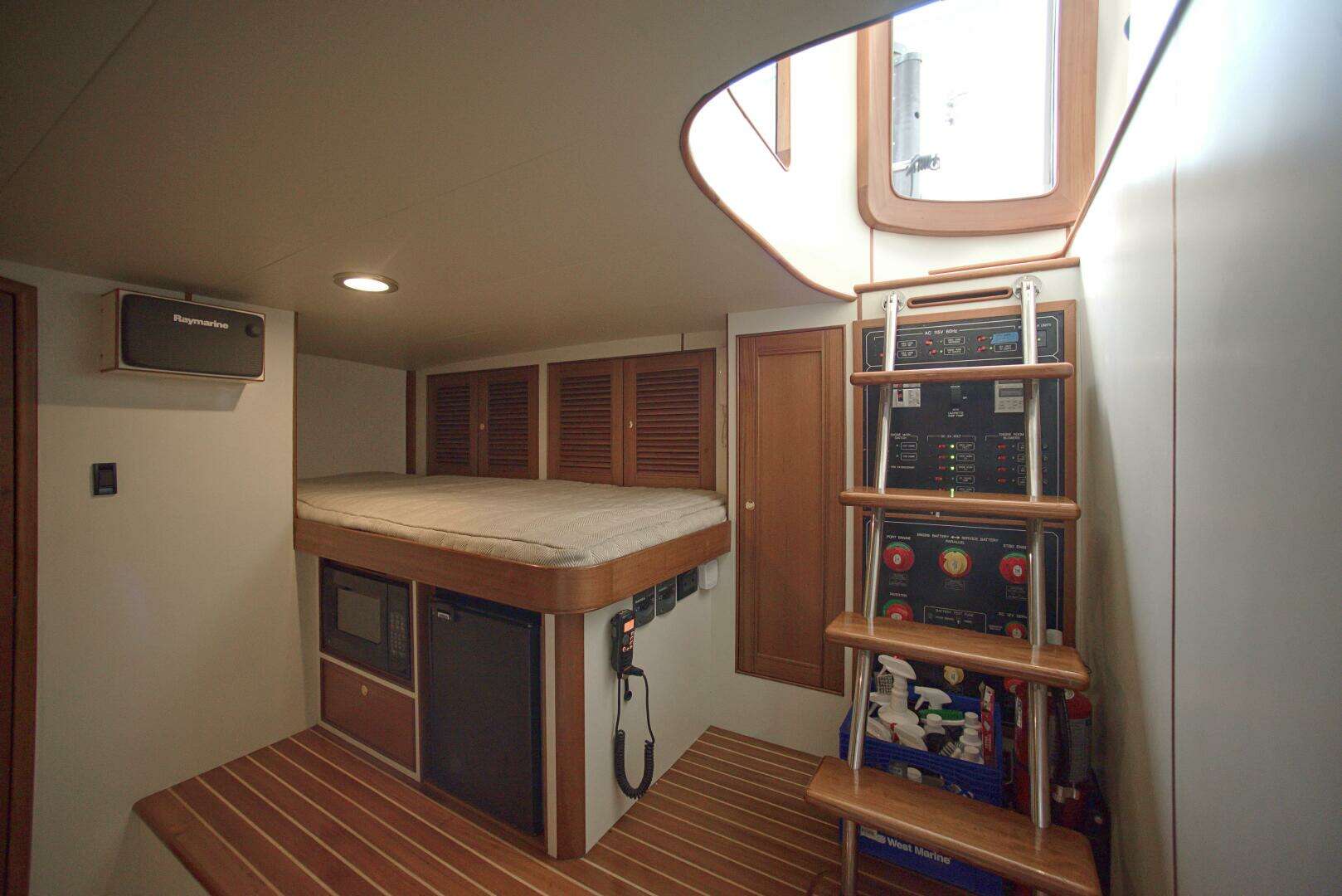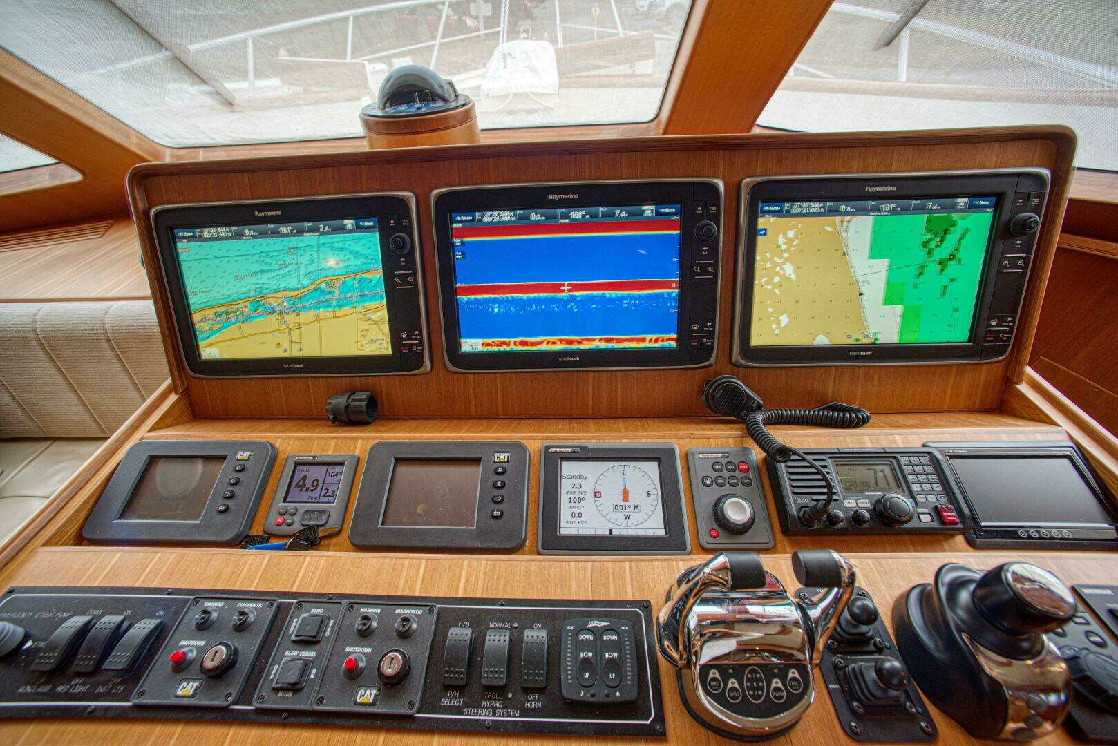 The central Flybridge station is an excellent place to run the boat and is the perfect open-air and open-water living space to enjoy the ocean while cruising. This is the preferred area for passengers when underway, with panoramic views of the ocean and waterways. In addition, the helm offers a grand living space separate from the main deck level, making her a more private space for yacht owners who spend months at a time on board. She has upgraded sun pads forward of the helm. She features two beautiful Stidd helm chairs, a full Raymarine electronics package, a large L-shaped settee, a beverage combination refrigerator with an ice maker, and a chart table. This open flybridge is simply a superb place for cruising and entertaining guests. This area is accessible by stairs from the pilothouse and from the aft cockpit stairs. She boasts plenty of storage and space for entertaining family and guests. New Enclosure Stereo system with upgraded speakers Subzero UC-24 beverage center refrigerator with ice maker Electric grill 800kg hydraulic davit with positioning and rotation-telescoping with remote Compass (2) Stidd ultra leather helm chairs Hydraulic power bow and stern thruster controls CAT digital engine monitors 12 volt outlet (2) Raymarine E-Series Hybrid Touch Screens Raymarine Autopilot ST70 and ST70+ ICOM M604 VHF radio Raymarine SR6 Sirius SAT weather and music Raymarine DSM300G Depth Sounder Xyenta Joystick Control KVH Tracvision HD7 Sat TV System Wesmar stabilizer control Engine synchronizer Windlass control CAT engine electronic displays Fuel and water tank monitor Bennett Trim Tabs