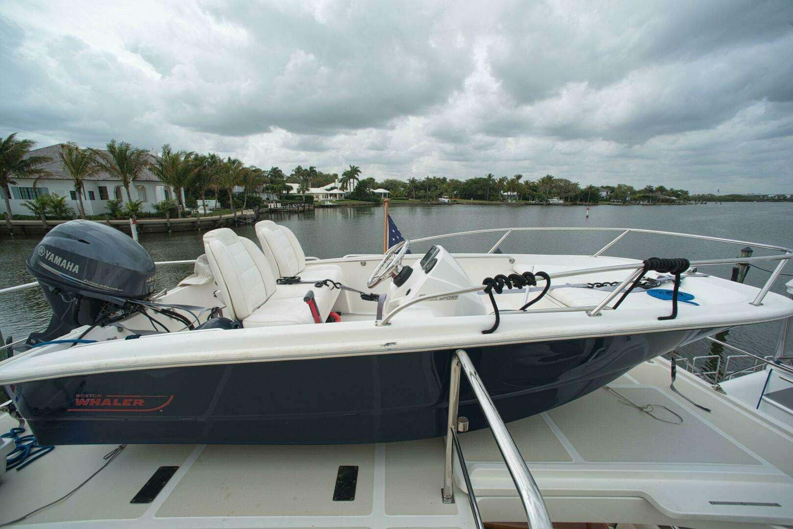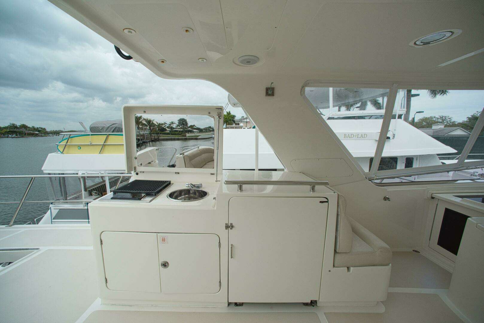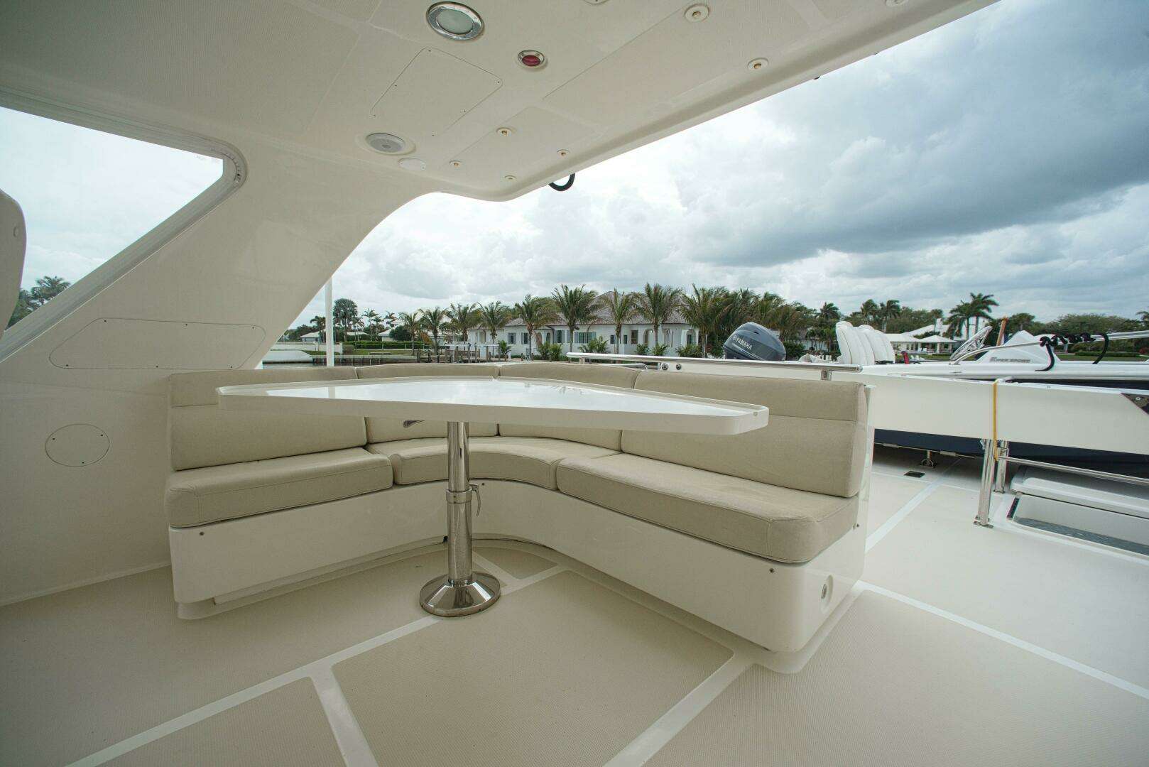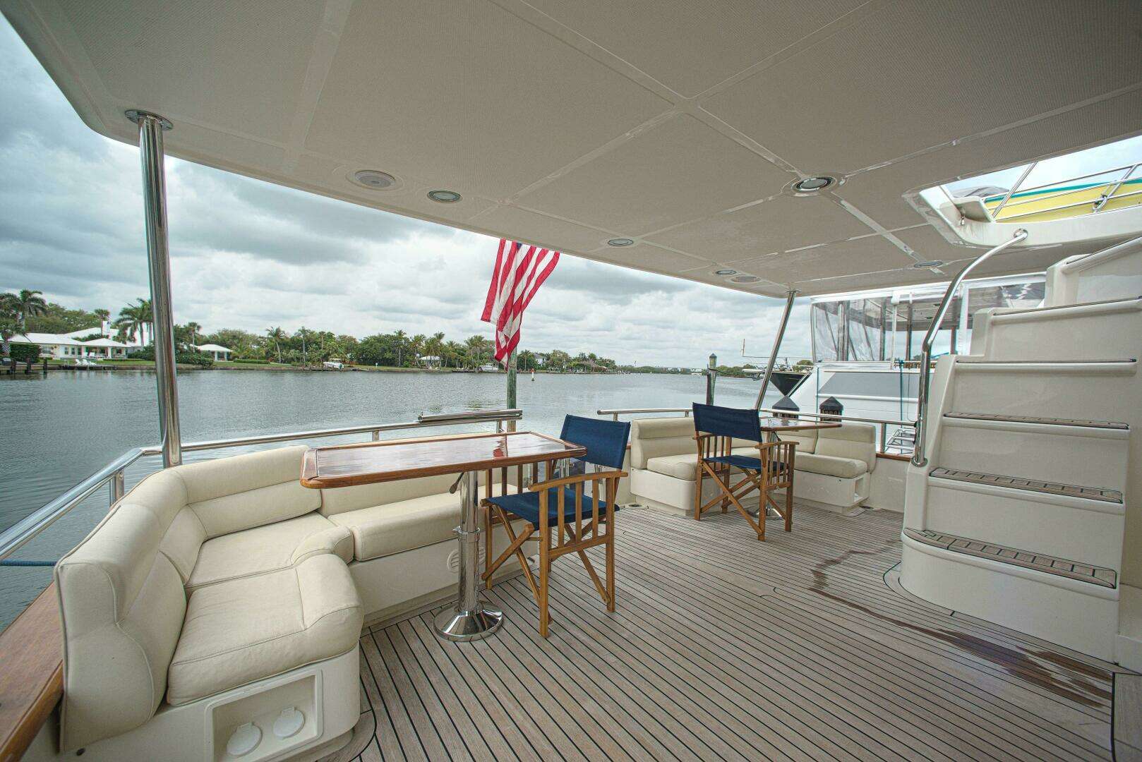 The central Flybridge station is an excellent place to run the boat and is the perfect open-air and open-water living space to enjoy the ocean while cruising. This is the preferred area for passengers when underway, with panoramic views of the ocean and waterways. In addition, the helm offers a grand living space separate from the main deck level, making her a more private space for yacht owners who spend months at a time on board. She has upgraded sun pads forward of the helm. She features two beautiful Stidd helm chairs, a full Raymarine electronics package, a large L-shaped settee, a beverage combination refrigerator with an ice maker, and a chart table. This open flybridge is simply a superb place for cruising and entertaining guests. This area is accessible by stairs from the pilothouse and from the aft cockpit stairs. She boasts plenty of storage and space for entertaining family and guests. New Enclosure Stereo system with upgraded speakers Subzero UC-24 beverage center refrigerator with ice maker Electric grill 800kg hydraulic davit with positioning and rotation-telescoping with remote Compass (2) Stidd ultra leather helm chairs Hydraulic power bow and stern thruster controls CAT digital engine monitors 12 volt outlet (2) Raymarine E-Series Hybrid Touch Screens Raymarine Autopilot ST70 and ST70+ ICOM M604 VHF radio Raymarine SR6 Sirius SAT weather and music Raymarine DSM300G Depth Sounder Xyenta Joystick Control KVH Tracvision HD7 Sat TV System Wesmar stabilizer control Engine synchronizer Windlass control CAT engine electronic displays Fuel and water tank monitor Bennett Trim Tabs