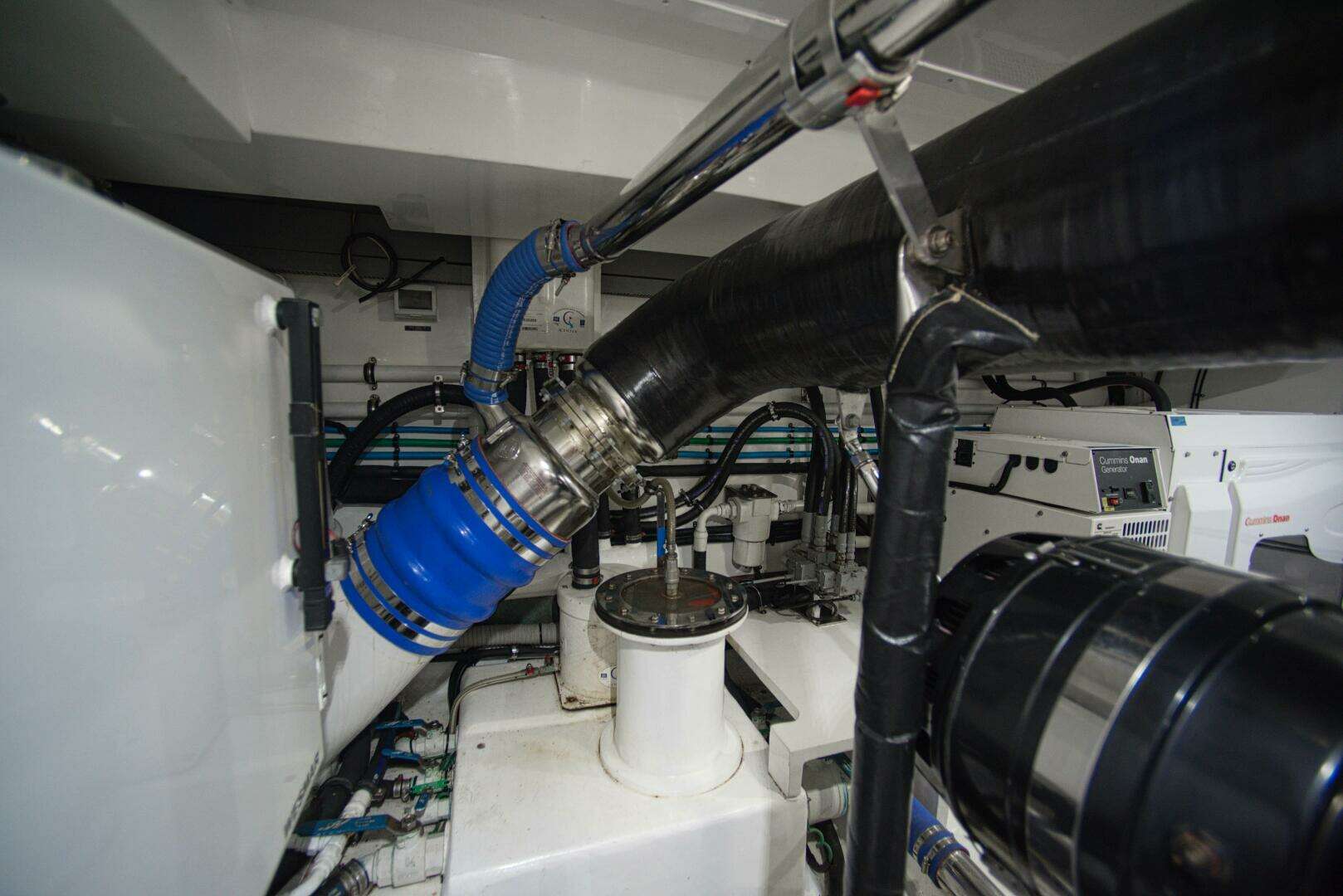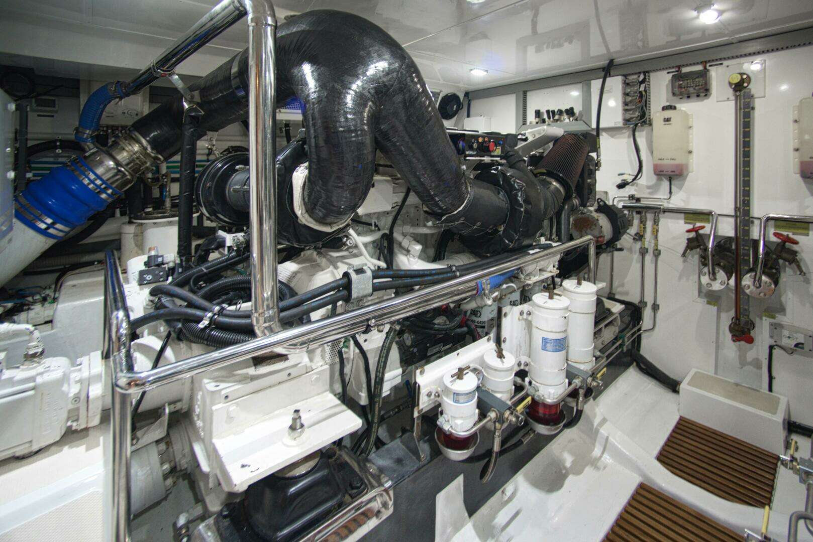 The full-size “standup” engine room area offers incredibly easy access to all equipment, engines, and systems, which provides excellent lighting and is air-conditioned for comfort and convenience when inspecting and performing maintenance. This engine room is very spacious, and both outboard sides can be easily reached. Upgraded and redundant Onan 17KW generators are perfect for the long-range cruiser who may visit New England in the summer and perhaps the Bahamas in the winter, perfect for long periods of at-anchor fun. There are 2 strategically placed entry positions to the engine room and crew quarters. One is exceptionally easy access from a tall watertight doorway from the aft cockpit, leading into a spacious, finished, and air-conditioned crew quarters and lazarette area. The other engine room entry is accessed from the door located on the aft swim platform steps for easy loading and unloading of materials, equipment, and other functions for convenience. • Twin 1015hp C-18 Caterpillars Diesel Engines only 960 hours• Velocijet Strut Keels, protect propellers from grounding and provide excellent tracking abilities• Wesmar stabilizers with dual station controls (pilot house and flybridge)• Hydraulic bow and stern thrusters• Hydraulic trim tabs• Engine synchronizer• 24 volt exhaust fans• High water/temperature/exhaust alarms• Racor Dual crossover fuel filtration system on engines and generators with vacuum gauges• Oil change system• Electronic controls at upper and lower stations and Aft deck station• Oil Filled Shaft system with thrust bearing• Color coded piping• Xenta Joystick Control• 900 GPD Sea Recovery Watermaker• Dual (redundant) Sea Chest for all seawater inlets• Air conditioning in engine room and crew quarters• Chilled water reverse cycle air conditioning throughout• AGM batteries• 5 blade S class Nibral props• Extensive noise insulation• Stainless steel water heaters• (2) Charles Isoboost Power Conditioner