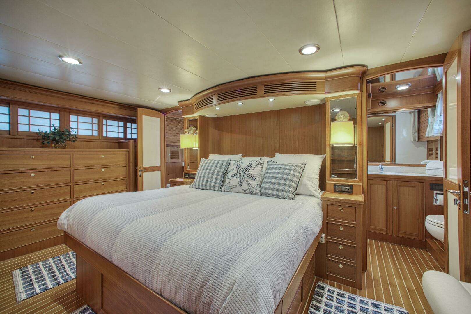 Upon entering this master stateroom, one walks through the gorgeous double doors. This specially designed extra-large full beam master suite has a custom king-size bed that lies centerline with its upgraded (2) privately separated his/her heads and the custom-created common shower between them. Abundant drawers, lockers, and hanging cabinets exemplify the Marlow Yachts philosophy of leaving no space unused. The quiet, chilled water air-conditioning system flows A/C or heat gently throughout the entire space. Teak and holly decks and beautiful teak bulkheads establish a warm and sumptuous feeling. This full beam master stateroom offers a very pleasing look with abundant teak and satin finish; large, fixed portholes throughout along with exquisite shoji screens on both port and starboard sides for letting the natural light in as well as excellent privacy when docked at a T head. Beautiful custom sofa settee is located port side of the master berth with an additional cabinet built underneath for even more storage space. The port holes in the head open and provide excellent cross ventilation when desired. • Custom Settee with sofa storage port• King size bed with custom memory foam mattress• Cedar lined hanging lockers• Air conditioning (reverse cycle chilled water)• Four drawers under berth and hidden storage• His/her private heads with common shower (2 sinks, 2 toilets)• MSR Heads windows open for cross ventilation when desired• Grohe fixtures• Sharp flat screen T.V.• Sony stereo with Samsung DVD player• Direct Satellite T.V.• Owner Safe