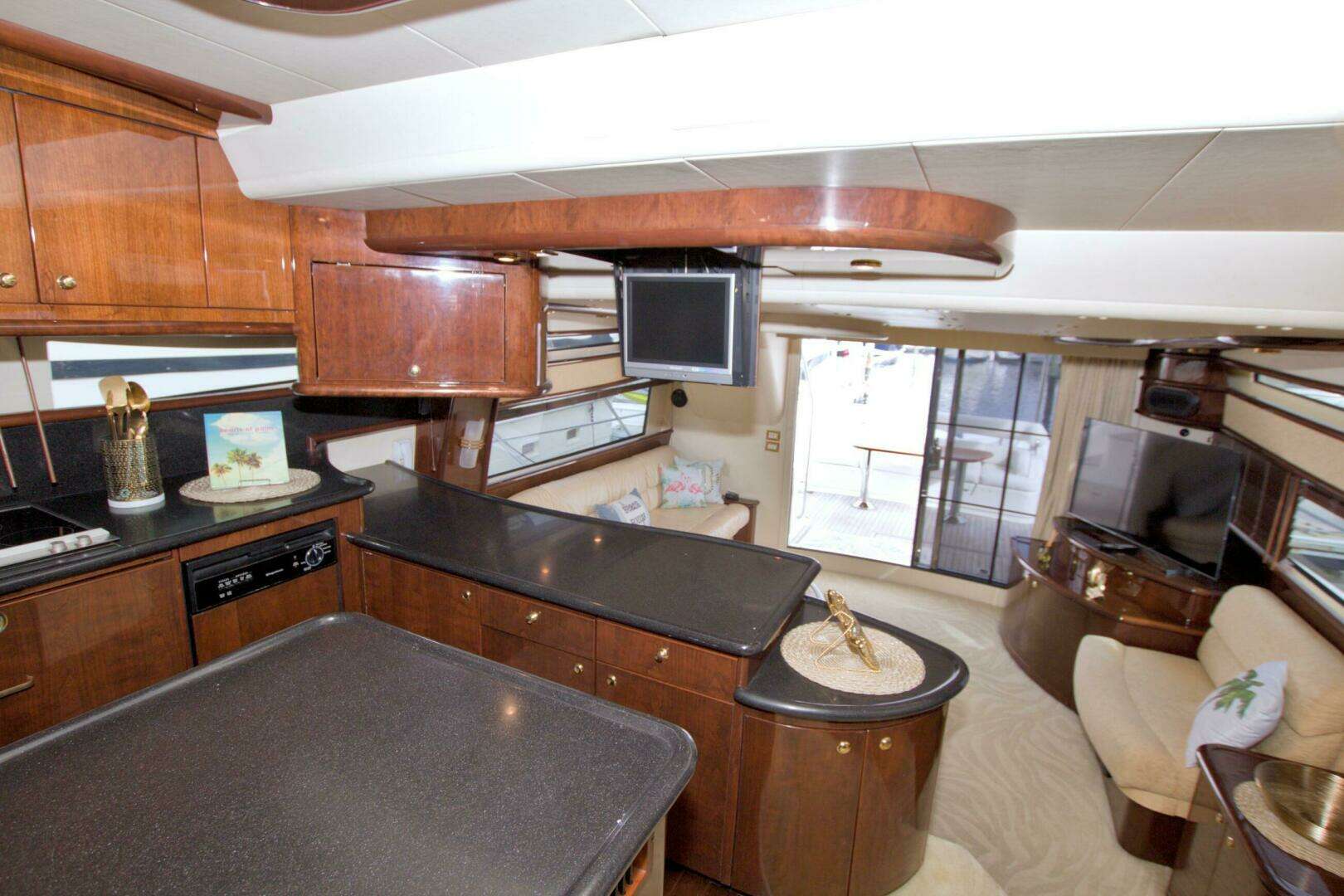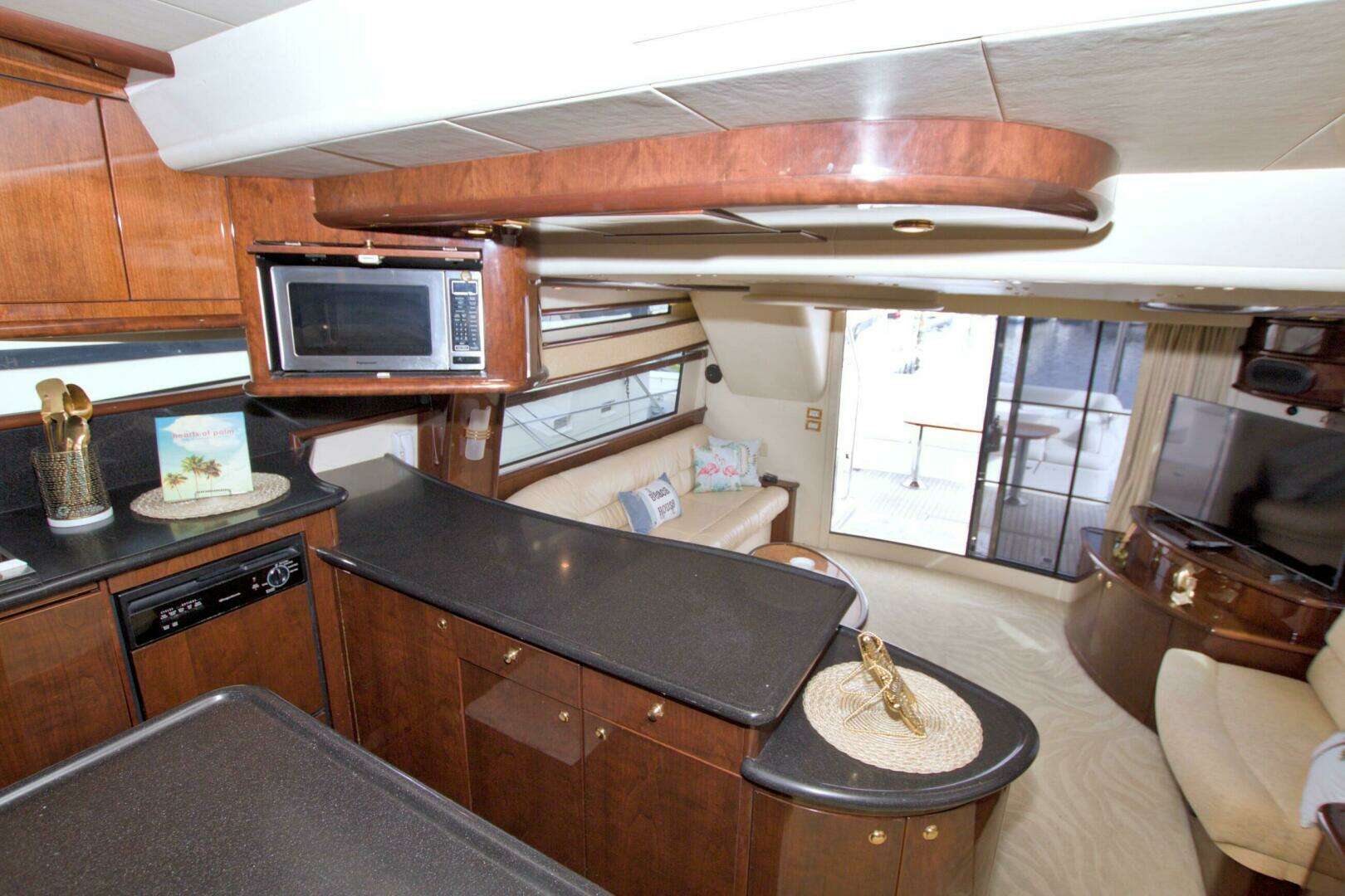 The interior includes a spacious salon, open galley with full appliances, Ultraleather seating, and high-gloss cherry joinery. Below, the yacht offers a 3-stateroom, 3-head layout. The upper deck hardtop with enclosure, upgraded electronics, making it perfect for entertaining.