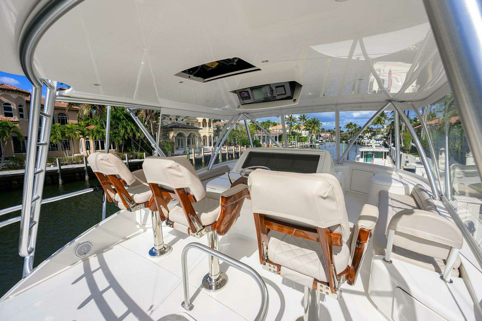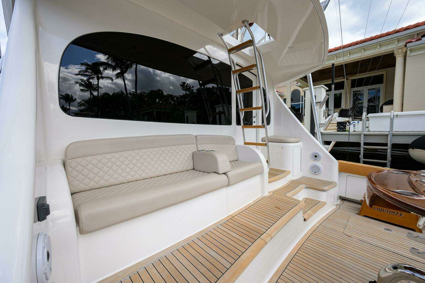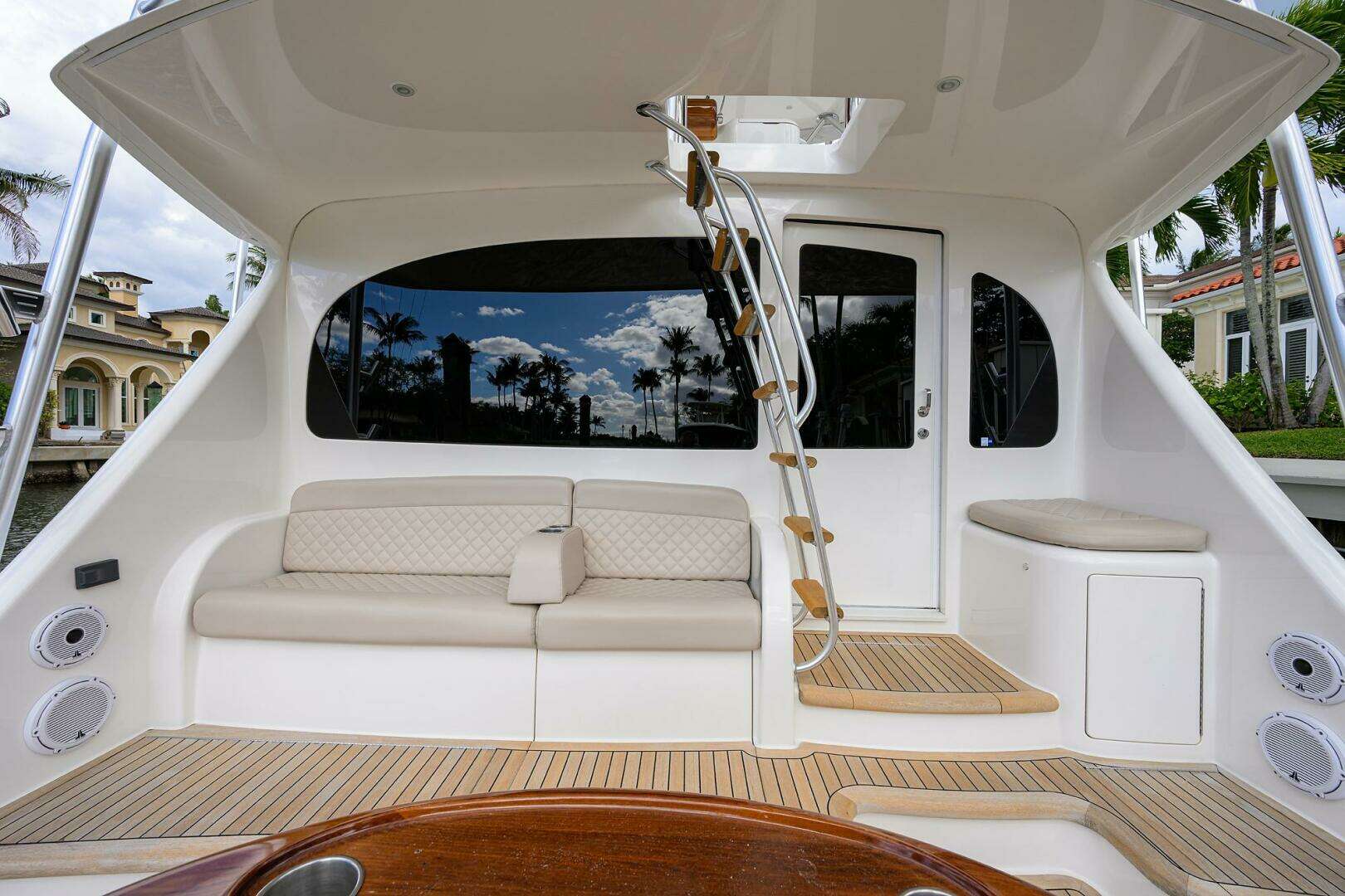 - Custom teak cockpit sole, mezzanine step, flybridge ladder steps and covering boards