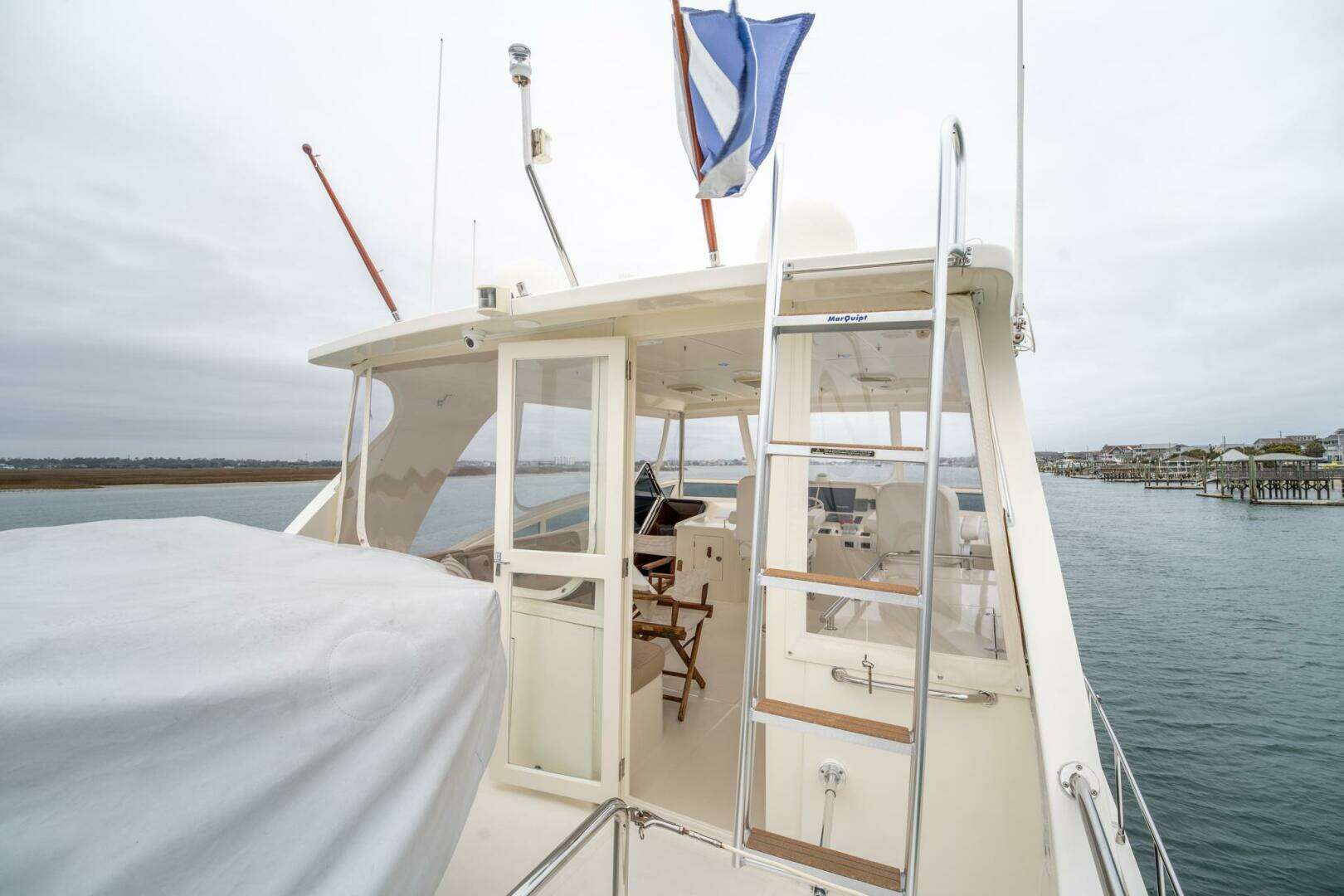 The starting point for each Hampton 630 is the 100% hand laid one-piece fiberglass hull that features solid fiberglass below the waterline with Kevlar reinforcing the hull and three outer layers of vinylester resin. The sharply V-forward hull sections give the 630 a soft and dry ride, while the flattened lines aft add to the stability as well as the efficiency for superior fuel economy. Propeller tunnels are used to level the engines, add directional stability, and allow shallow water adventuring. Picture yourself at the helm in the Hampton 630 Pilothouse A comfortable pilothouse settee with a beautiful burl inlayed table allows your family and friends to keep you company. You will discover one of the reasons that the Hampton 630 is the perfect yacht. When the weather is chilly or wet, the pilothouse is shirtsleeve comfortable while, in warm weather, the pilothouse remains an air-conditioned haven. From the helm, aircraft-style stainless steel pilothouse doors lead to the wide side decks.