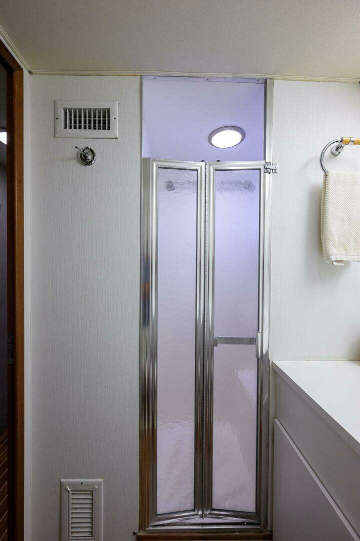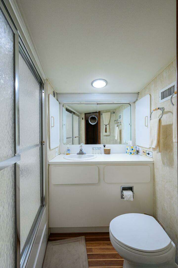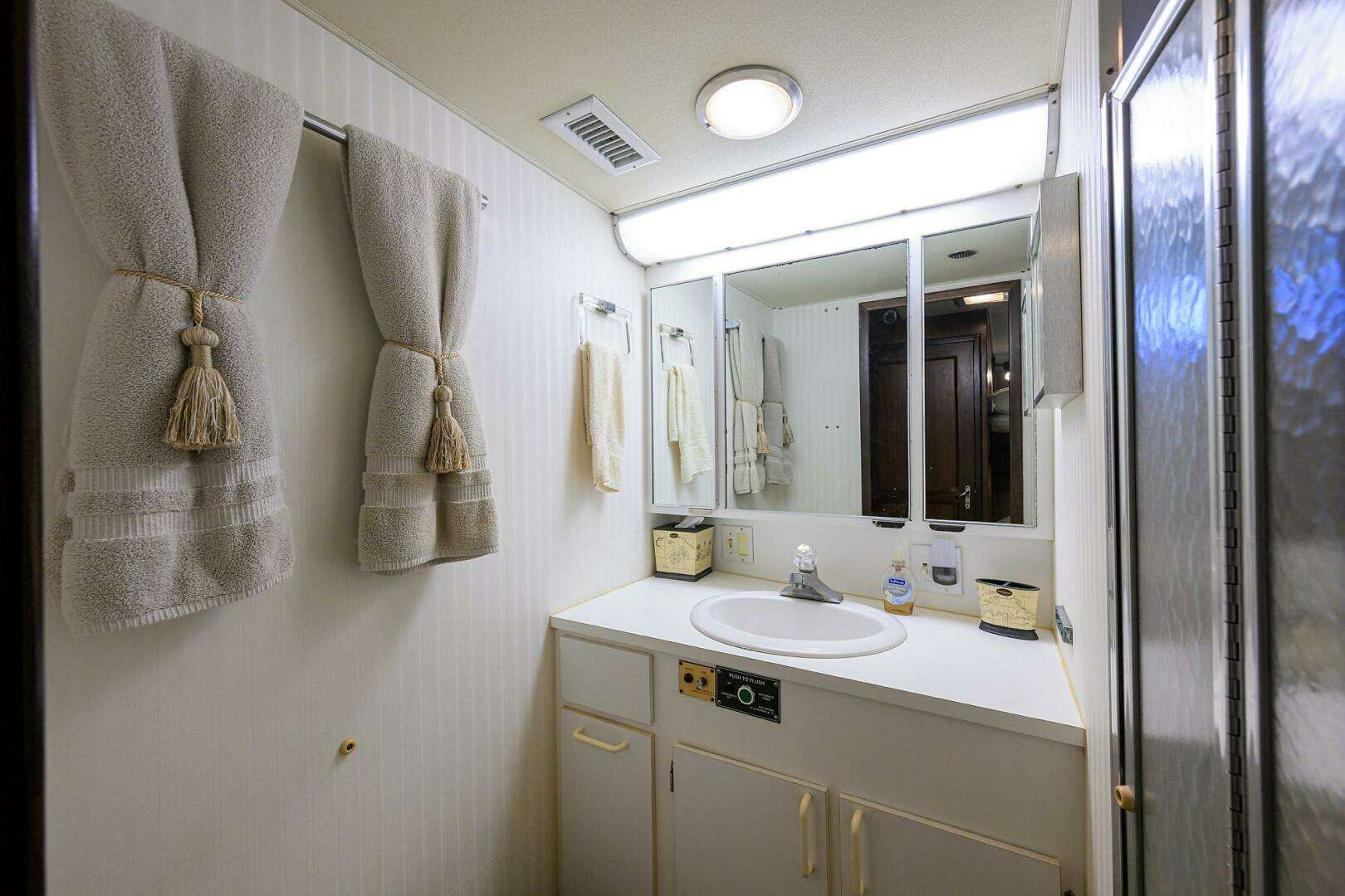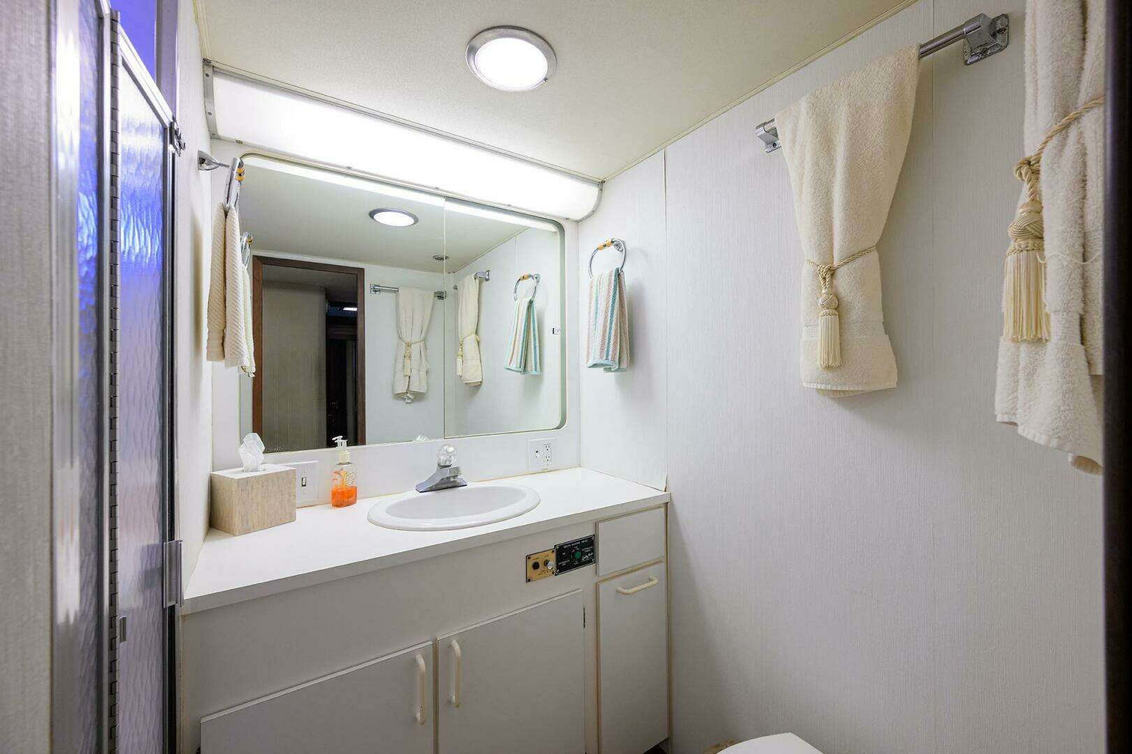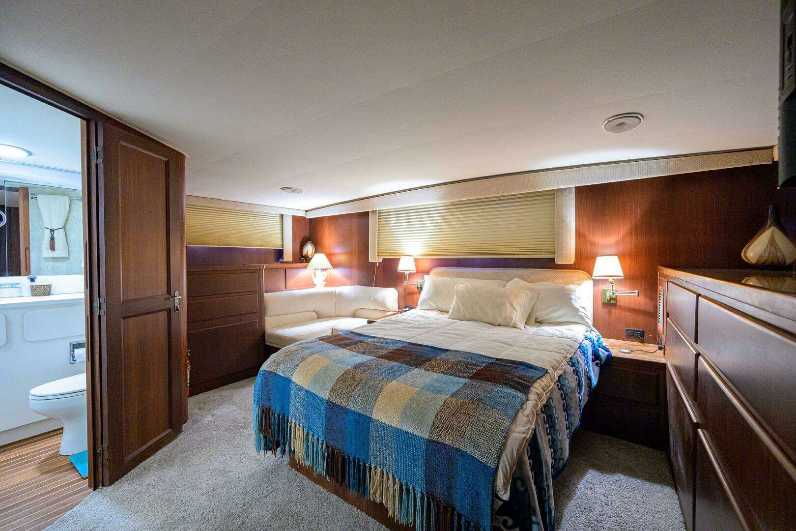- The primary stateroom is located aft of the twin engine rooms, allowing for privacy and features a king size bed with an abundance of storage and closet space.