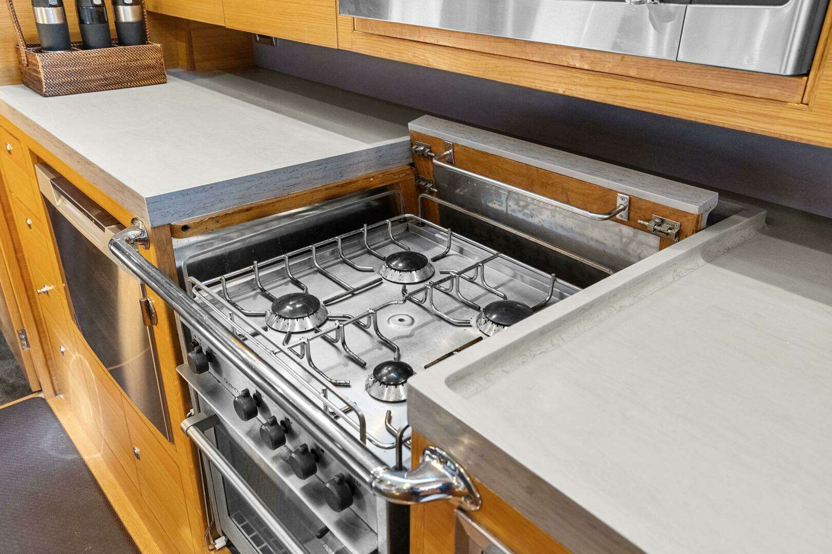 - Galley features: dishwasher, 6 Vitrofrigo drawers fridge/freezer, trash compactor, built in coffee maker, built in wine cooler (by salon settee), Ocean Chef 4 burner propane stove top with oven and a GE Convection/Microwave oven - with 12V fan - RO water has secondary filter at galley tap